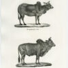 Onderwerp: Antieke prent, getiteld: ‘Pl. 152. De Nijlghau van witvoetige Antilope – De Gnu van Bosch-buffel.’ – Dit bord toont de Nilgai of Blue Bull en de Wildebeest of Gnu.