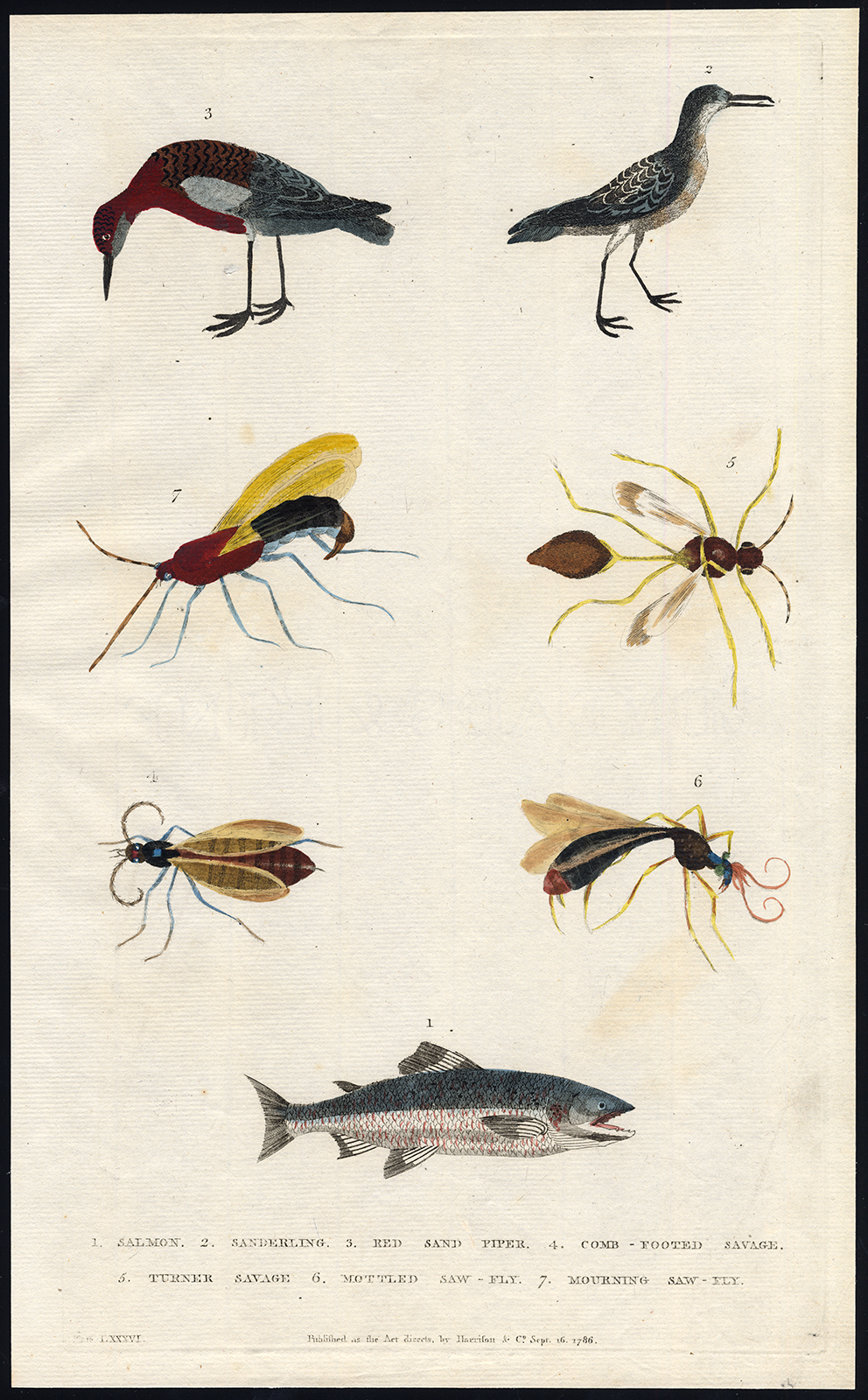 Onderwerp: Plaat LXXXVI: Op deze plaat zijn diverse diersoorten afgebeeld; 1. Zalm – 2. Sanderling – 3. Rode zandfluit – 4. Kamvoetwild – 5. Turner Savage – 6. Gevlekte zaagvlieg – 7. Rouwzaagvlieg.
