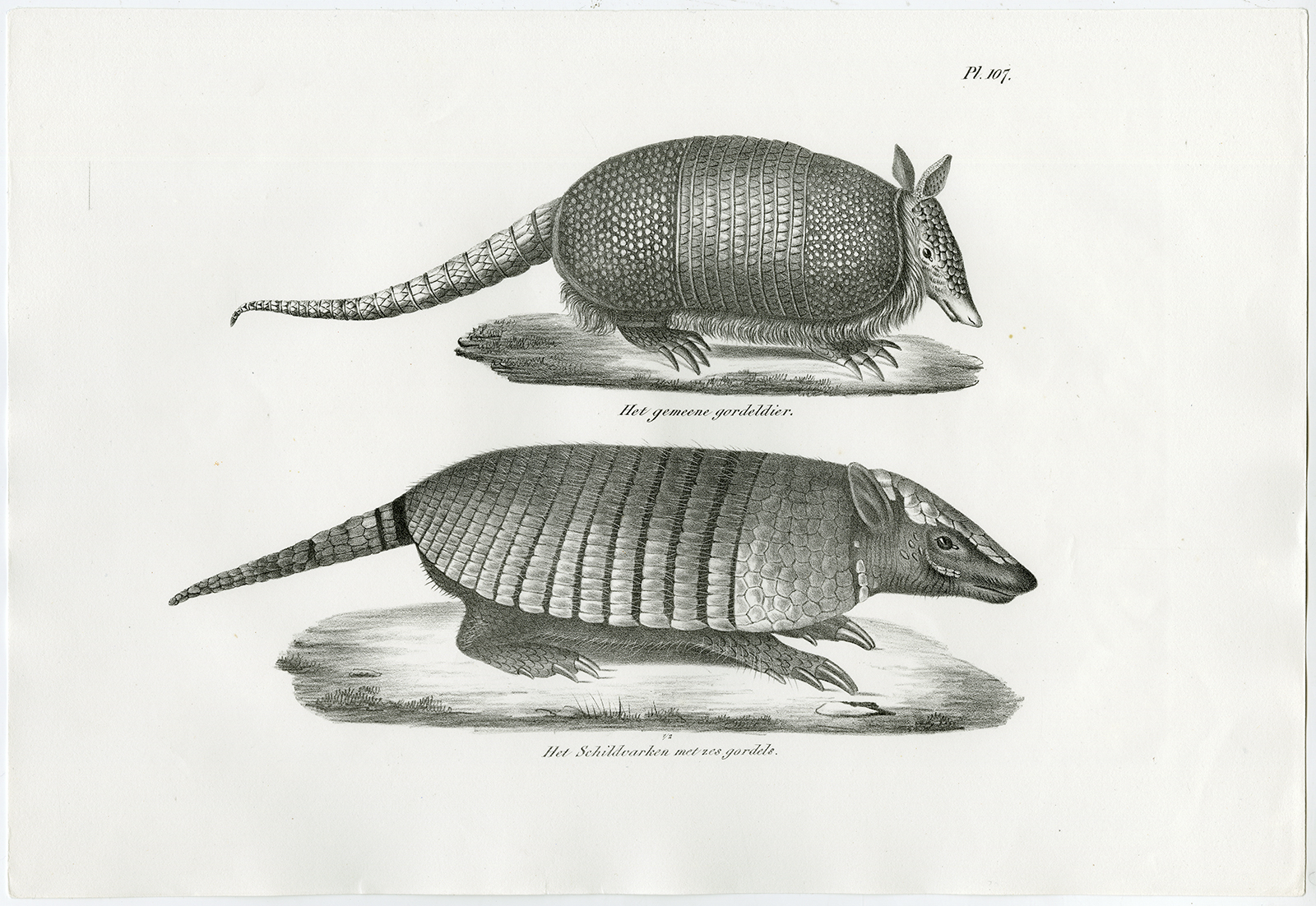 Onderwerp: Antieke prent, getiteld: ‘Pl. 107. Het gemeenzame gordeldier – Het Schildvarken met zes gordels.’ – Op deze plaat zijn het gewone gordeldier en het zesbandige gordeldier afgebeeld.