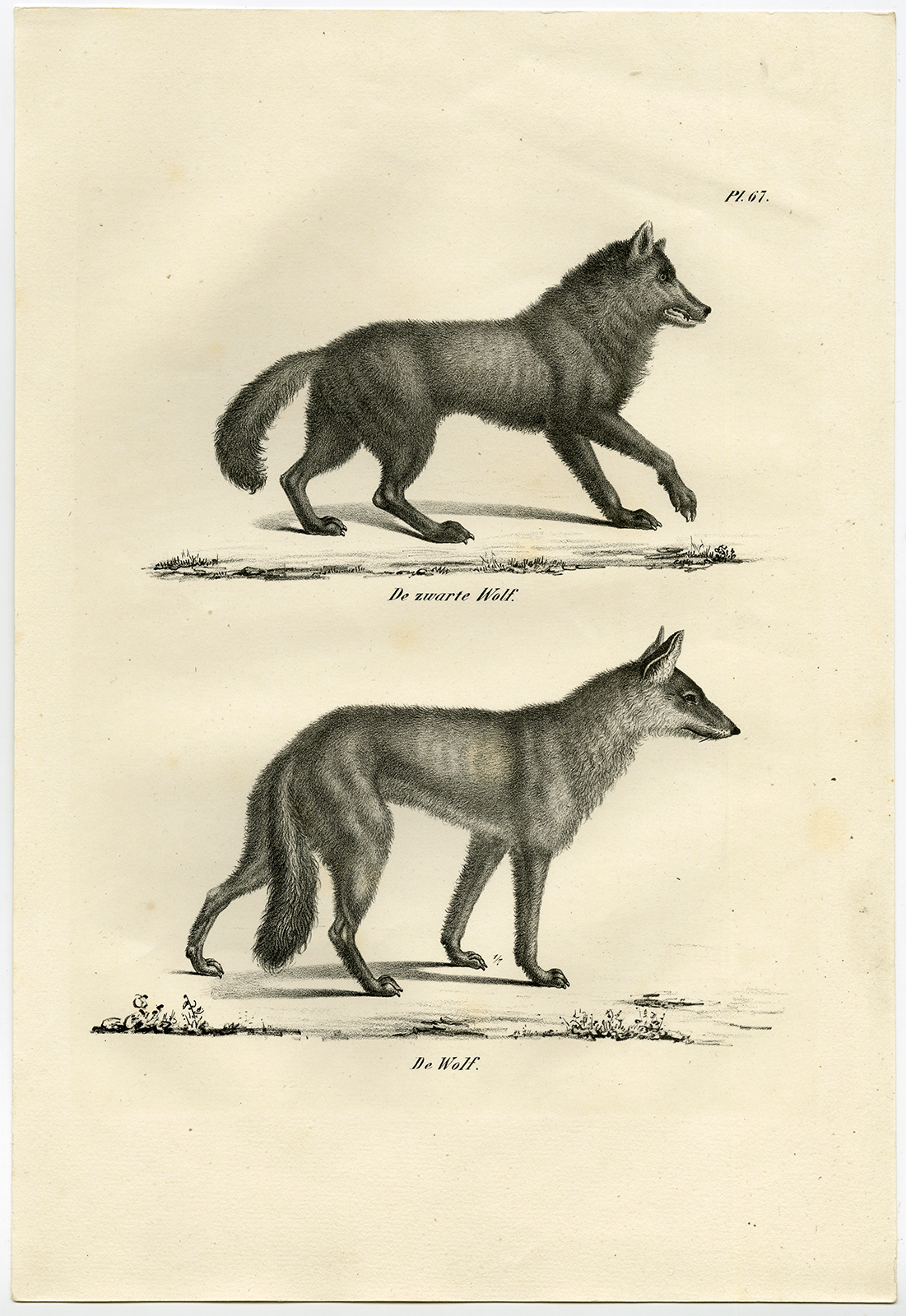 Onderwerp: Antieke prent, getiteld: ‘Plaat 67: ‘De zwarte wolf – De wolf’.’ – Dit bord toont de zwarte wolf en de grijze wolf.