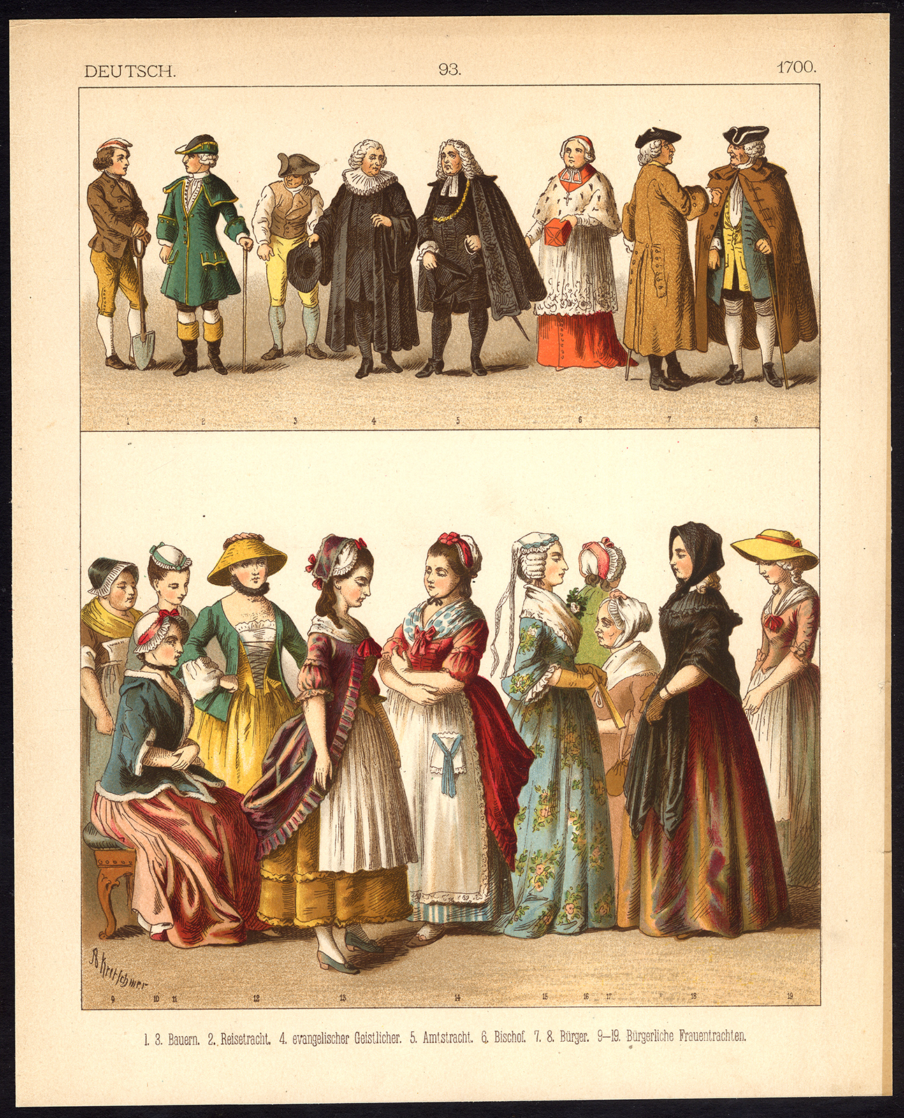 Onderwerp: Plaat 93: ‘Deutsch – 1700.’ Dit bord toont Duitse kostuums van rond 1700 n.Chr.; boeren, evangelische geestelijken, bisschop, burgers etc.