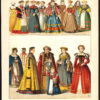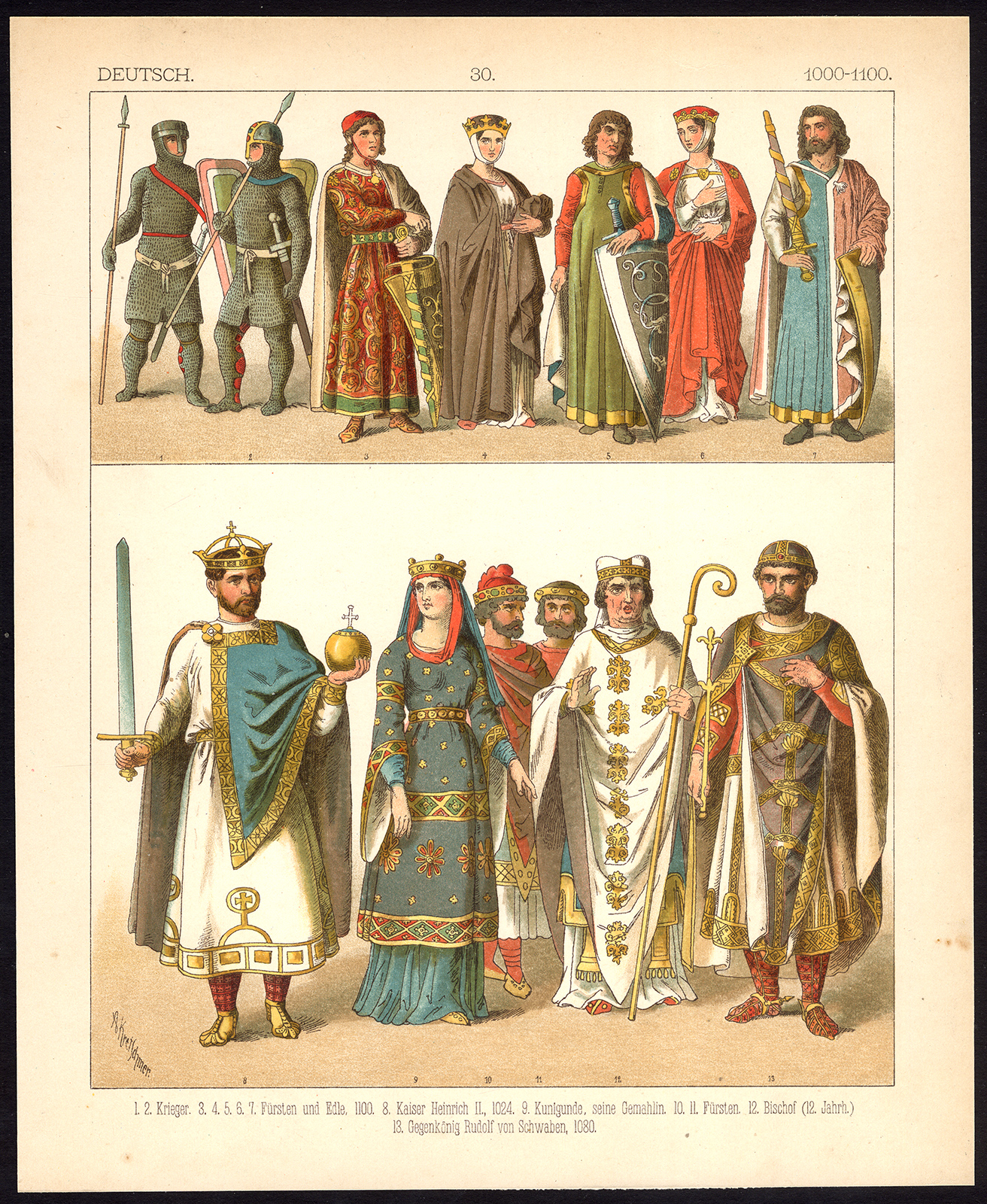 Onderwerp: Plaat 30: ‘Deutsch – 1000-1100.’ Dit bord toont Duitse kostuums uit de periode 1000 – 1100 n.Chr.; Koning, adel, bisschop, krijger, keizer Heinrich II etc.