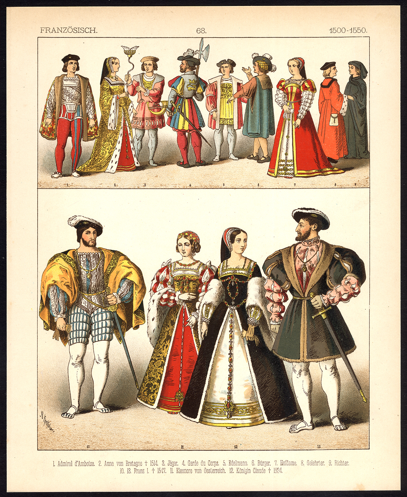 Onderwerp: Plaat 68: ‘Franzosisch – 1500-1550.’ Dit bord toont Franse kostuums uit ongeveer 1500-1550 n.Chr.; Admiraal d’Amboise, jager, edelman, burgers, rechter, François I, Eleonore van Oostenrijk, koningin Claude enz..
