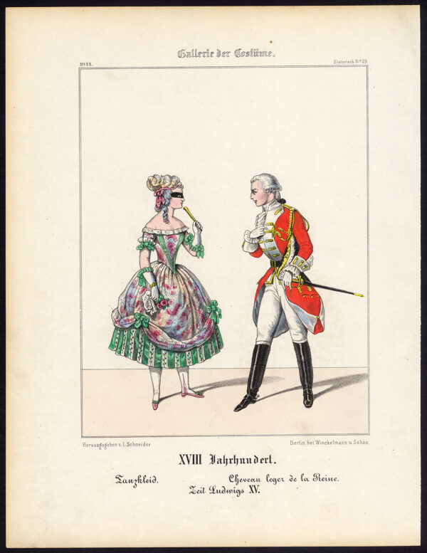 Onderwerp: Plaat: ‘XVIII Jahrhundert. Tanzkleid – Cheveau leger de la Reine. Zeit Ludwigs XV’. (18e eeuw. Danskostuum – Chevau-leger van de koningin. Onder koning Lodewijk XV van Frankrijk).