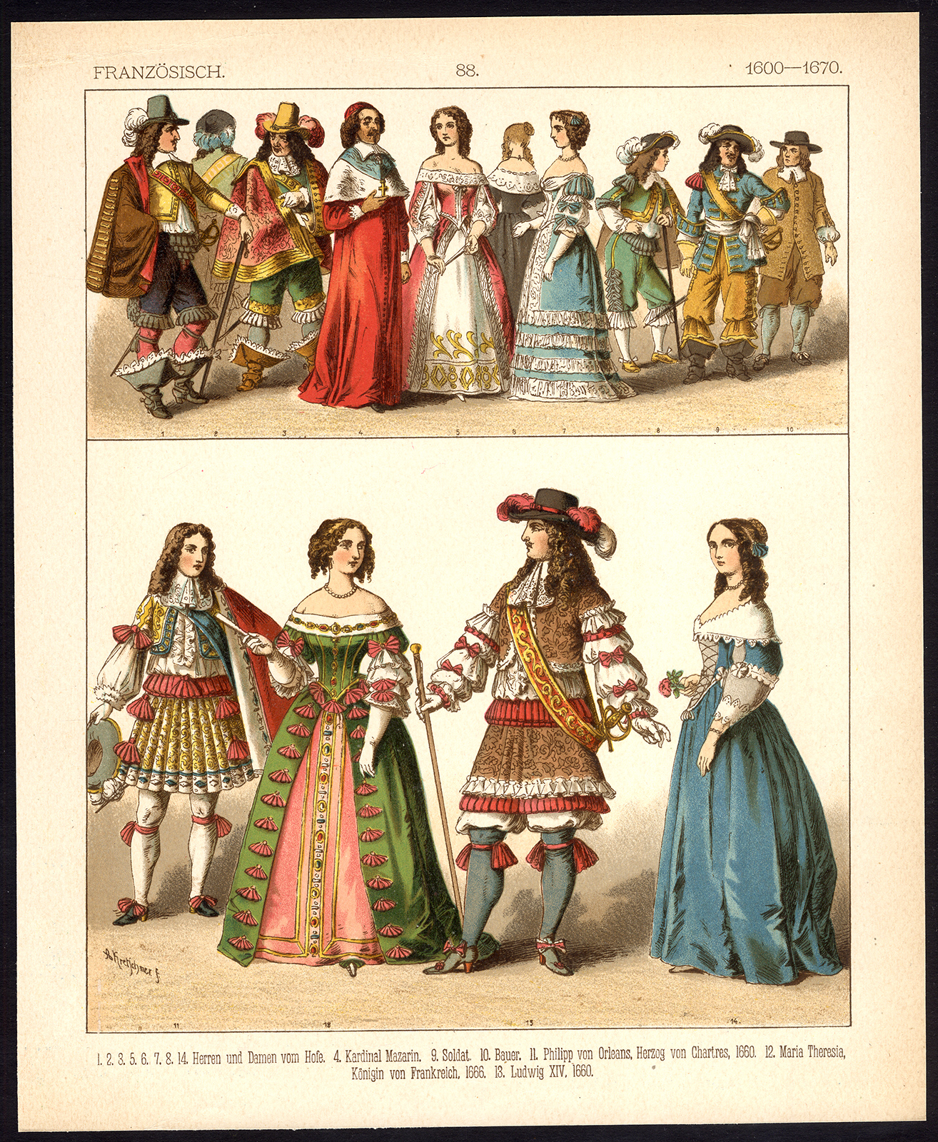 Onderwerp: Plaat 88: ‘Franzosisch – 1600-1670.’ Dit bord toont Franse kostuums tussen 1600 en 1670 n.Chr.; adel, kardinaal Mazarin, soldaat, boer, Philippe d’Orleans, koningin Maria Theresia, Lodewijk XIV etc.