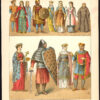 Onderwerp: Plaat 27: ‘Frankisch – 800.’ Dit bord toont kostuums van de Franken rond 800 na Christus; adel, krijger, Karel de Kale etc.