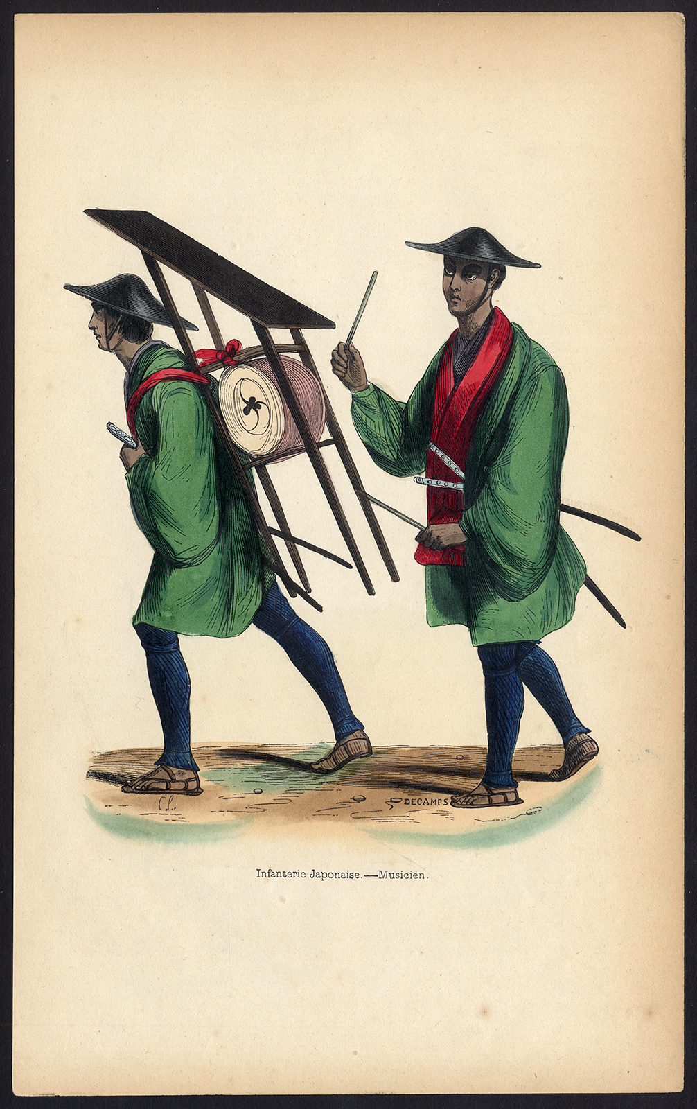 Onderwerp: Plaat: ‘Infanterie Japonaise – Musicien.’ Dit bord toont het kostuum van de muzikanten (drummers) van de Japanse infanterie. Eén man draagt een grote trommel op zijn rug, waarop de tweede moet slaan.