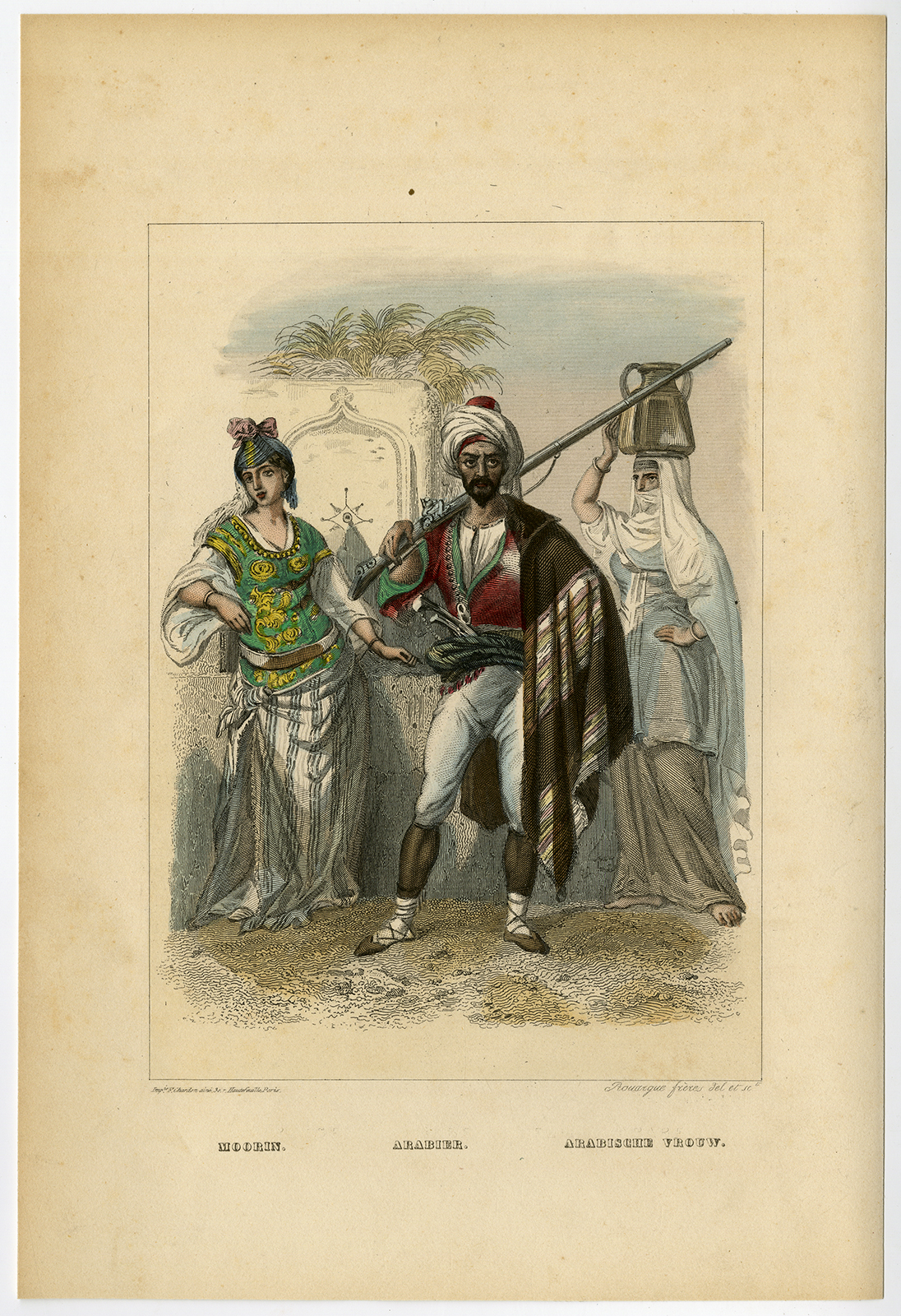 Onderwerp: Plaat: ‘Moorin – Arabier – Arabische vrouw’. Dit bord toont 19e-eeuwse kostuums van een Moorse vrouw, een Arabier en een Arabische vrouw.