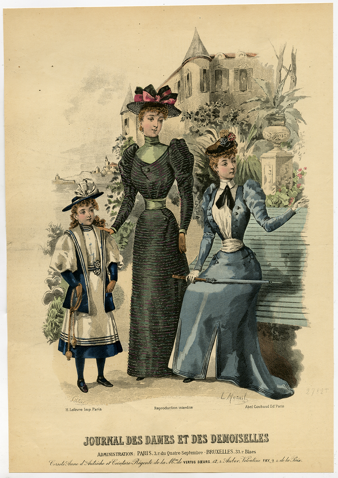 Antieke print-MODE-KOSTUUM-JURK-VROUW-MEISJE-PL. 2782-Lefevre-c. 1860