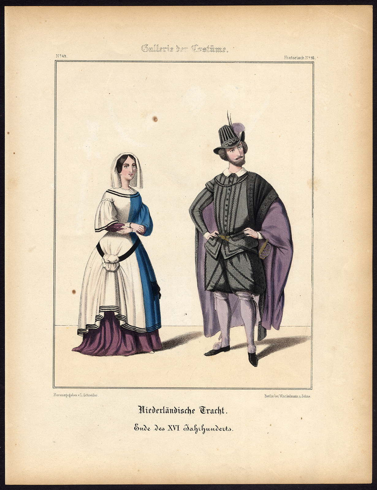 Onderwerp: Plaat: ‘Niederlandische Tracht, Ende des XVI Jahrhunderts’. (Nederlandse klederdracht, eind 16e eeuw).