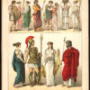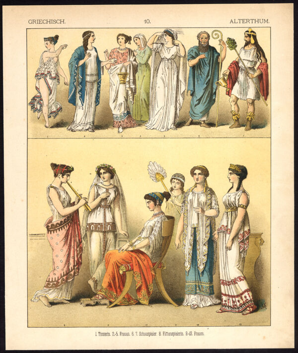 Onderwerp: Plaat 10: ‘Griechisch – Alterthum.’ Dit bord toont kostuums uit het oude Griekenland; danser, acteur, vrouw, muzikant etc.