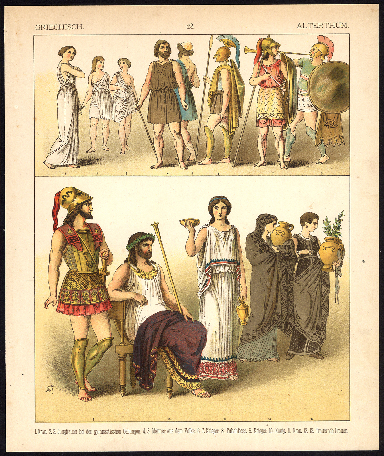 Onderwerp: Plaat 12: ‘Griechisch – Alterthum.’ Dit bord toont kostuums uit het oude Griekenland; koning, krijger, rouwende vrouwen etc.
