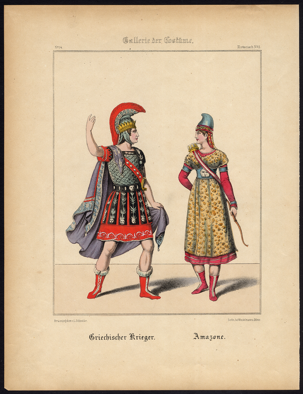 Antieke print-SOLDAAT-GRIEKENLAND-AMAZONE-WARRIOR-KOSTUUM-Schneider-1844