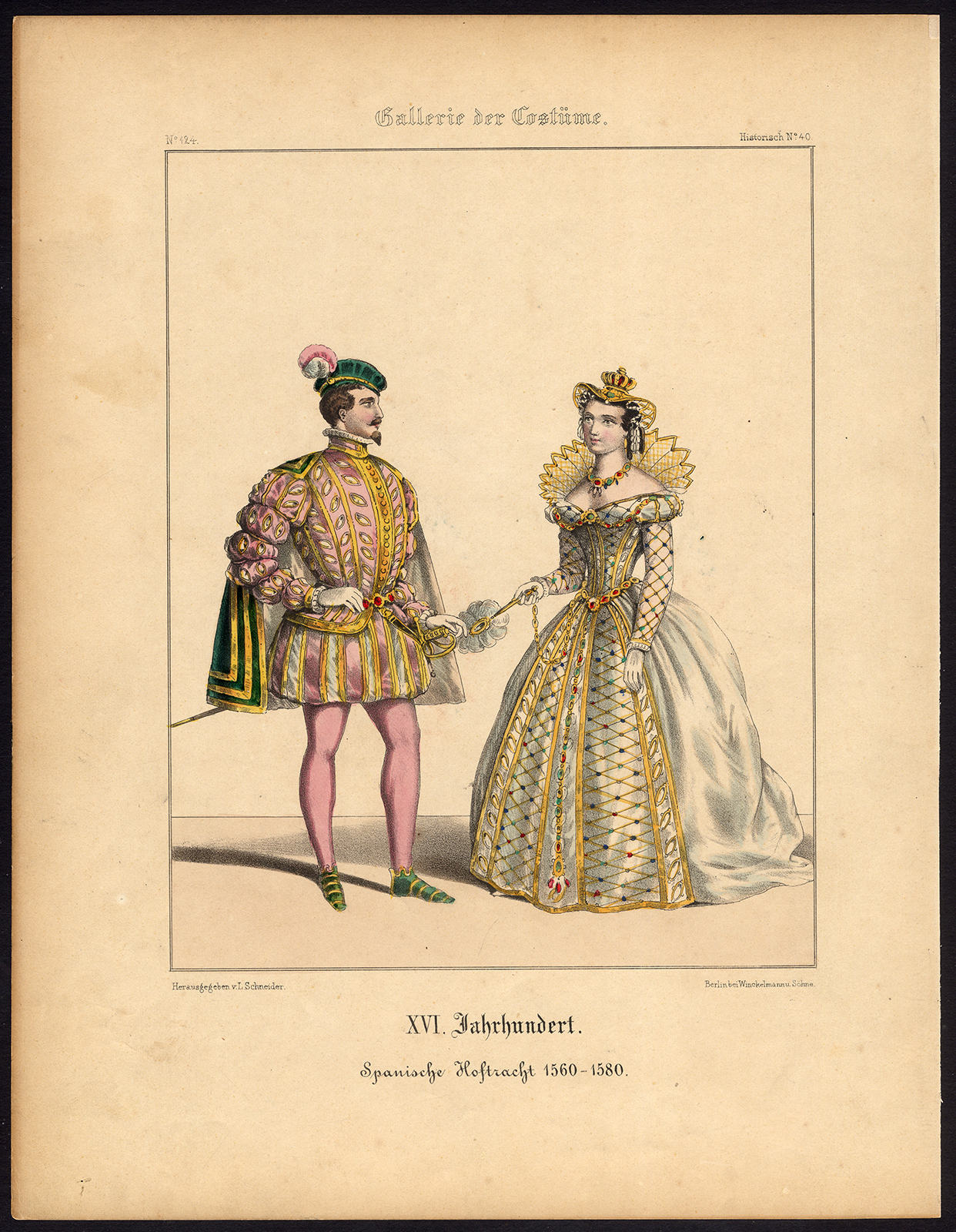 Onderwerp: Plaat: ‘XVI Jahrhundert. Spaanse Hofgracht 1560 – 1580’. (16e eeuws Spaans koninklijk hofkostuum, 1560 – 1580).