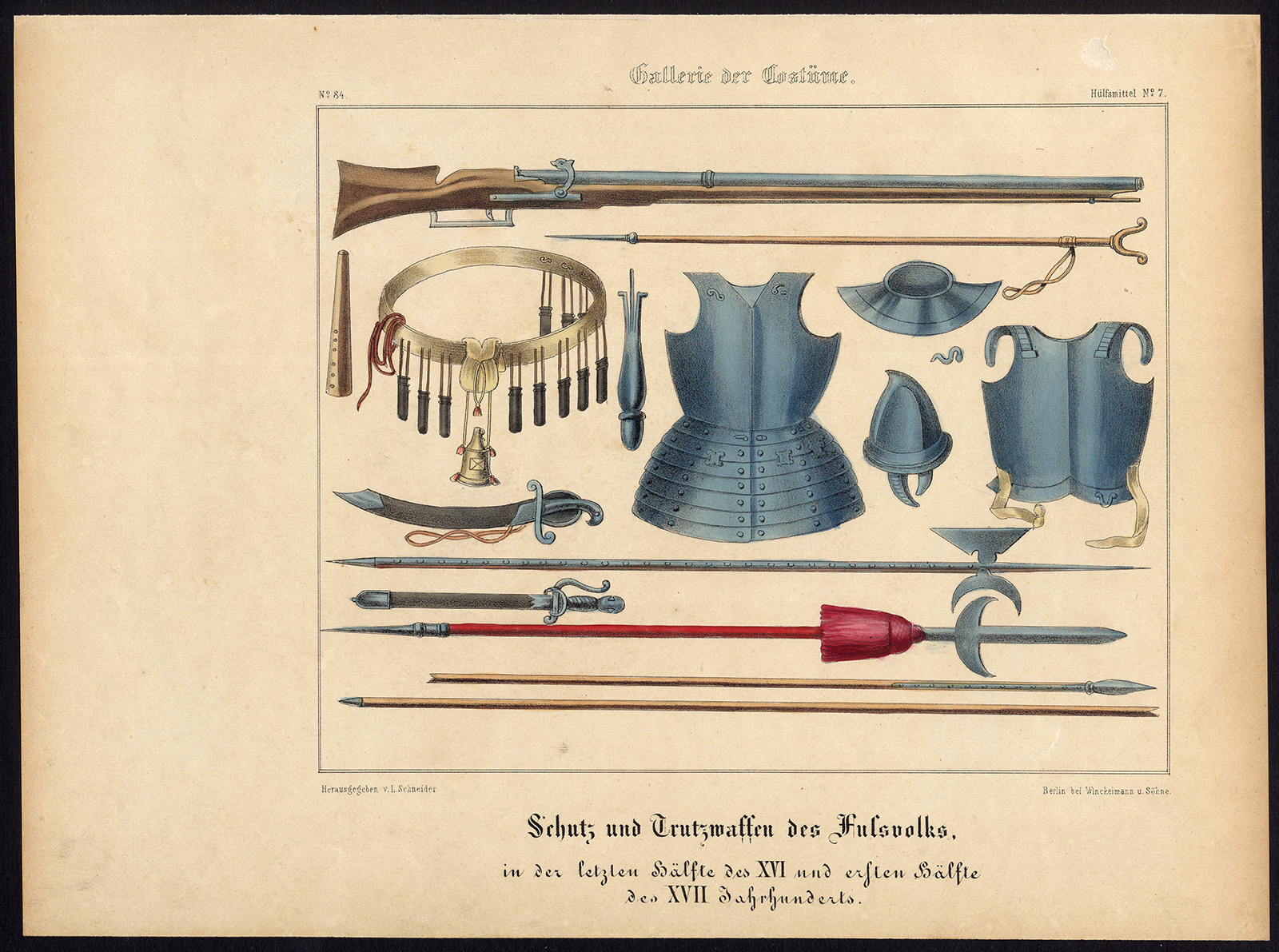 Onderwerp: Plaat: ‘Schutz und Trutzwaffen des Fussvolks in der lezten Halfte des XVI und ersten Halfte des XVII Jahrhunderts’. (Wapens en bepantsering van infanteriesoldaten in de tweede helft van de 16e eeuw en de eerste helft van de 17e eeuw).