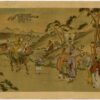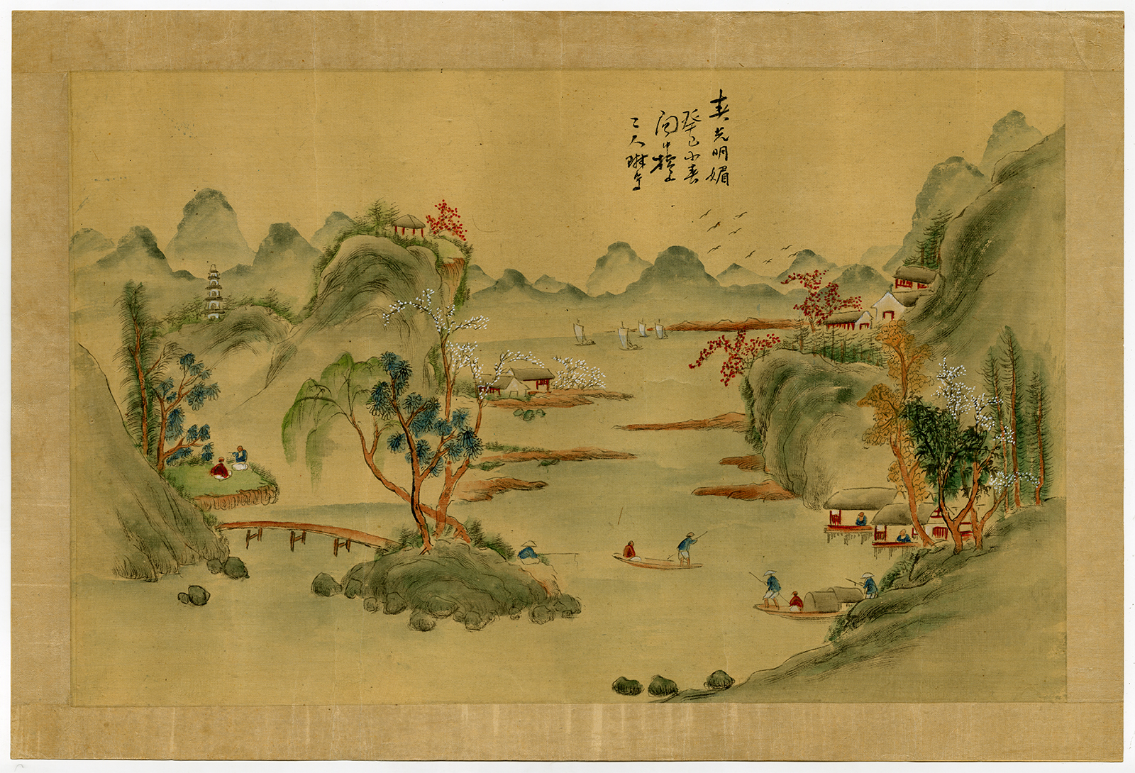 Onderwerp: Antieke tekening, zonder titel. Japanse prent met een bergachtig landschap en vissende mensen. Op de achtergrond varen zeilboten. Het blad is afgezet met stof voor presentatiedoeleinden.