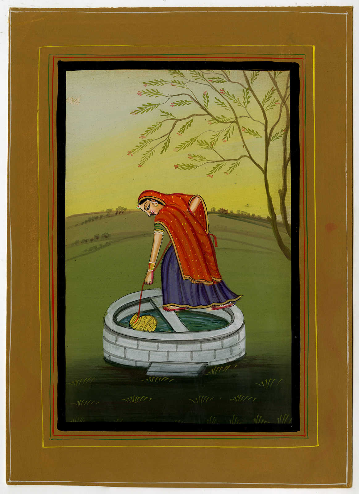 Onderwerp: Antieke tekening, zonder titel. Dit originele vintage/antieke miniatuurschilderij toont een vrouw in traditionele klederdracht die een kan uit een put vult, waarschijnlijk Perzisch of Indiaas.