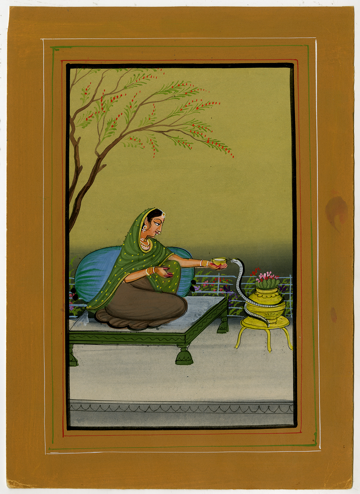 Antieke tekening-VROUW-KOSTUUM-SLANG-INDIA-MINIATUUR-IV-Anoniem-20e eeuw.