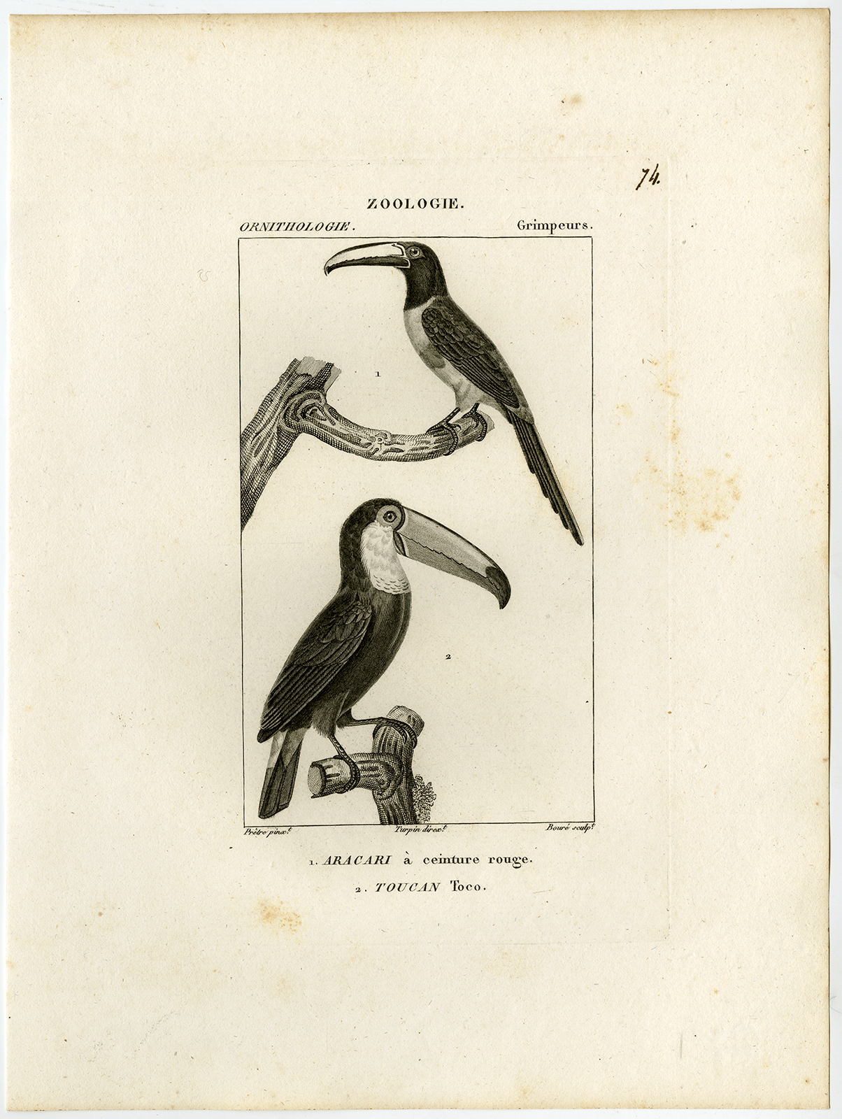 Onderwerp: Antieke prent, getiteld: ‘Pl. 74. Zoölogie, ornithologie, Grimpeurs. 1. Aracari a ceinture rouge – 2. Toucan toco.’ – Dit bord toont vogelsoorten; aracari en toco toekan.