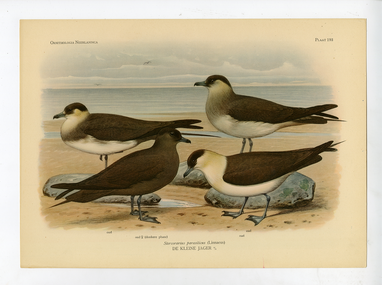 Onderwerp: Antieke prent, getiteld: ‘Pl. 193. Ornithologica Neerlandica. Stercorarius parasiticus – De Kleine Jager’ – Deze plaat toont de parasitaire jager (Stercorarius parasiticus), ook bekend als de Arctische jager of parasitaire jager, vrouwtje.