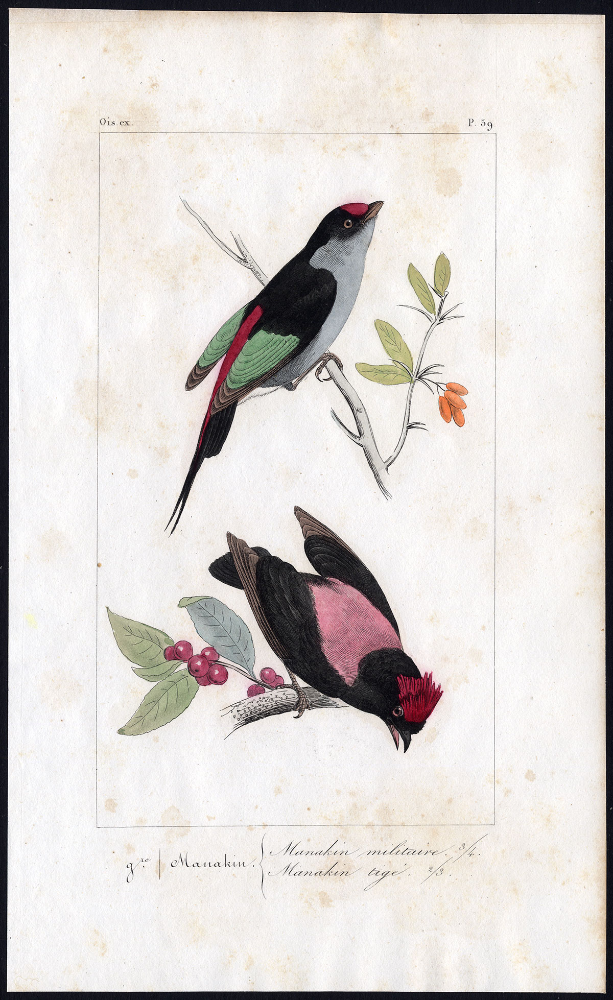 Onderwerp: Origineel bord van een duur werk, getiteld: Gre. Manakin – Manakin militaire / Manakin tige (Pipra militaris & Pipra parcola / Pin-Tailed Manakin & Blue-backed Manakin).
