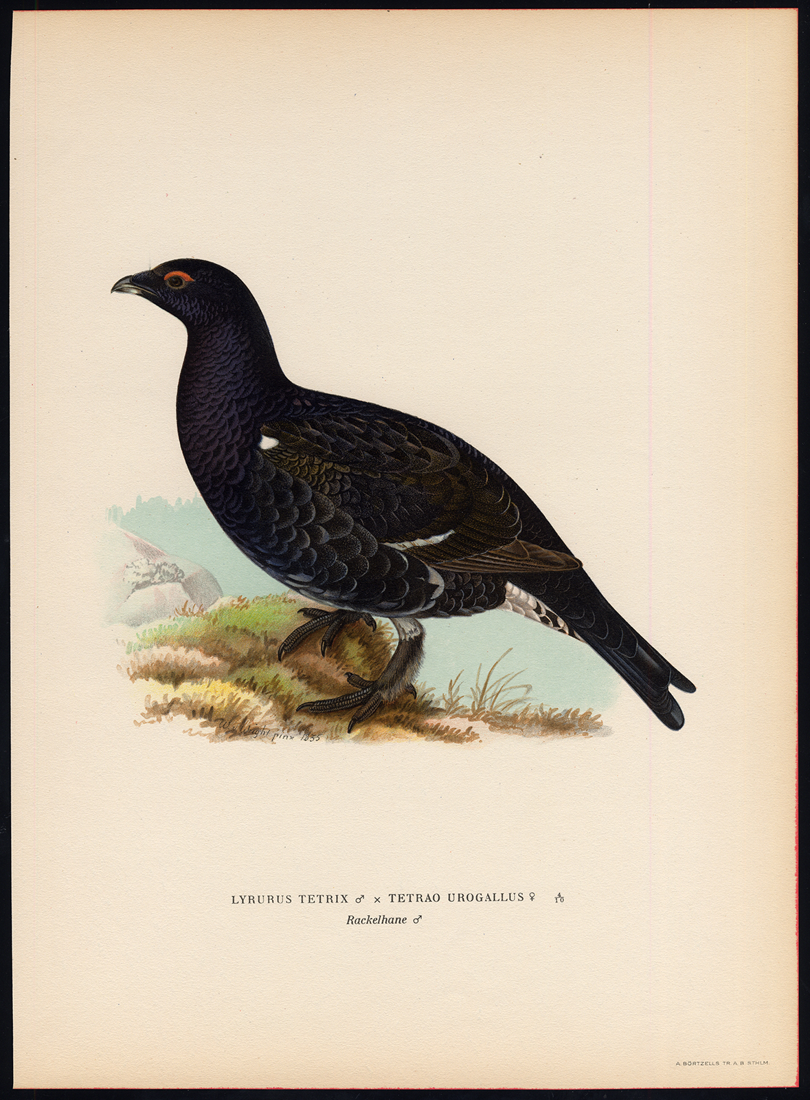 Onderwerp: Plaat : ‘Lyrurus tetrix Lin x Tetrao urogallus.’ (Kruis tussen Tetrao tetrix – korhoen, mannetje en Tetrao urogallus – auerhoen of boshoen, vrouwtje).