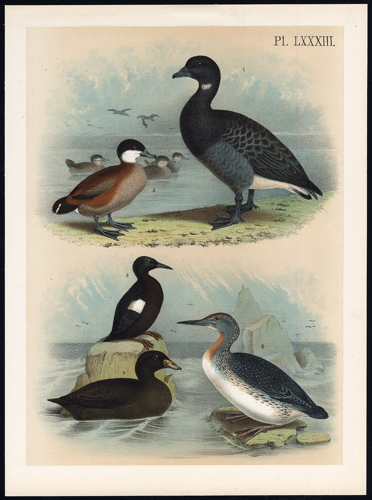 Onderwerp: Plaat LXXXIII: Deze plaat toont vogelsoorten; 1. Brantgans, Black Brant, Brant of Rott – 2. Ruddy Duck – 3. Black Guillemont-Sea Pigeon – 4. Roodkeelduiker – 5. Amerikaanse Zwarte Zee-eend, of Zwarte Zee-eend.