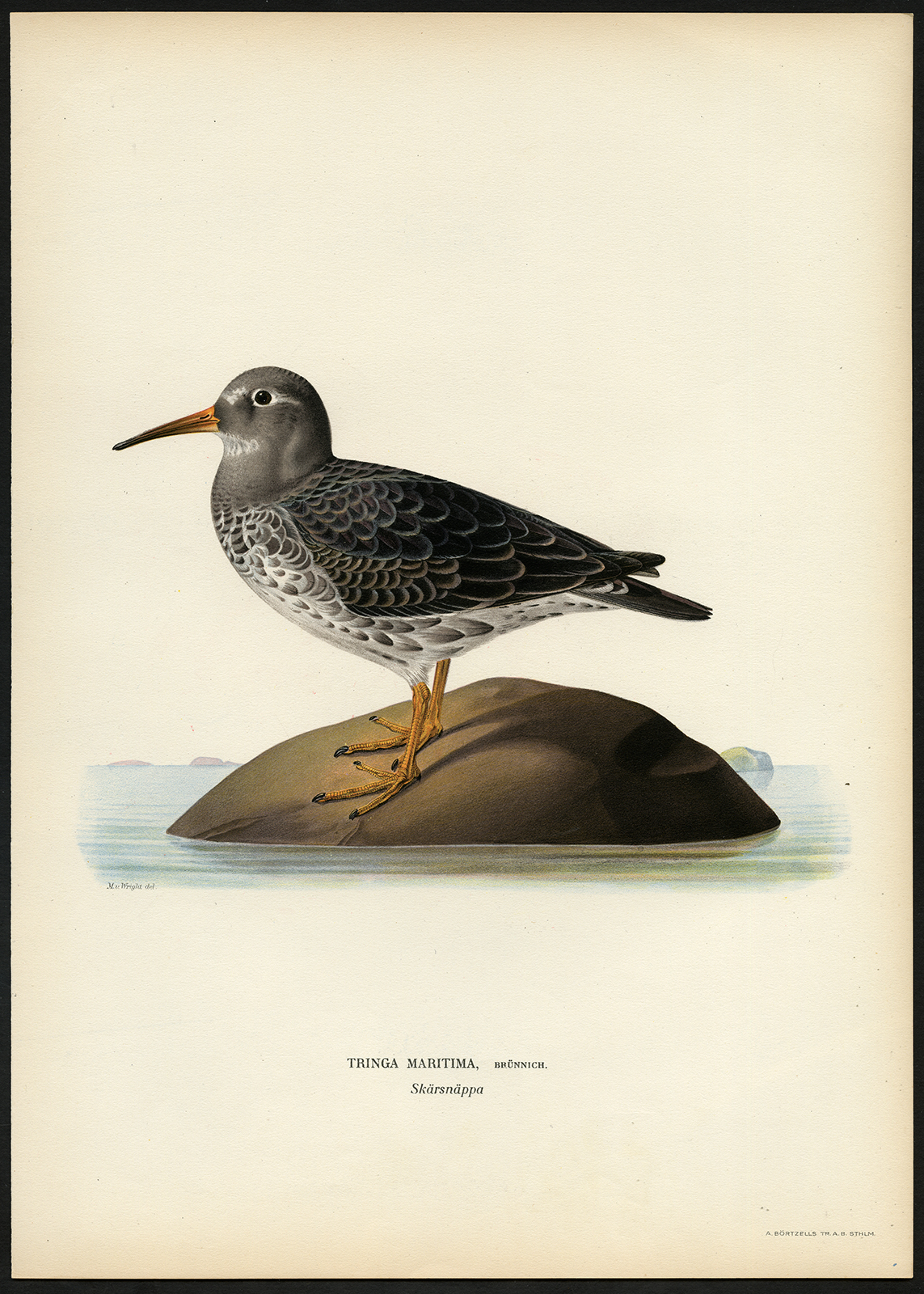 Onderwerp: Bord : ‘Tringa maritima Brunnich.’ (Paarse Strandloper – Calidris maritima).