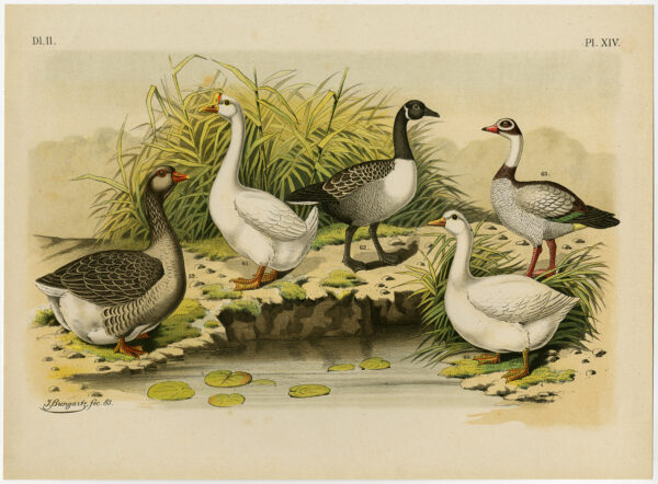 Onderwerp: Antieke prent, getiteld: ‘Pl. XIV.’ – Op dit bord staan verschillende ganzen afgebeeld; Canadese gans, sneeuwgans, Brantgans enz.