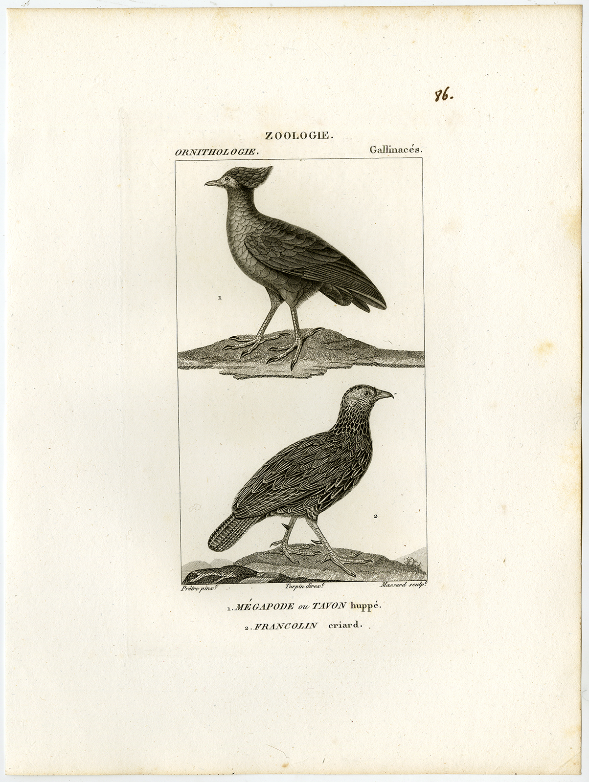 Onderwerp: Antieke prent, getiteld: ‘Pl. 86. Zoölogie, Ornithologie, Gallinaces. 1. Megapode ou Tavon huppe – 2. Francolin criard.’ – Dit bord toont vogelsoorten; megapode en Kaapse dwergfowl, of Kaapse frankolijn.