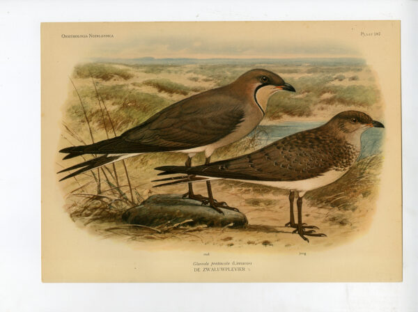 Onderwerp: Antieke prent, getiteld: ‘Pl. 187. Ornithologica Neerlandica. Glareola pratincola – De Zwaluwplevier’ – Deze plaat toont de pratincole of gewone pratincole (Glareola pratincola).