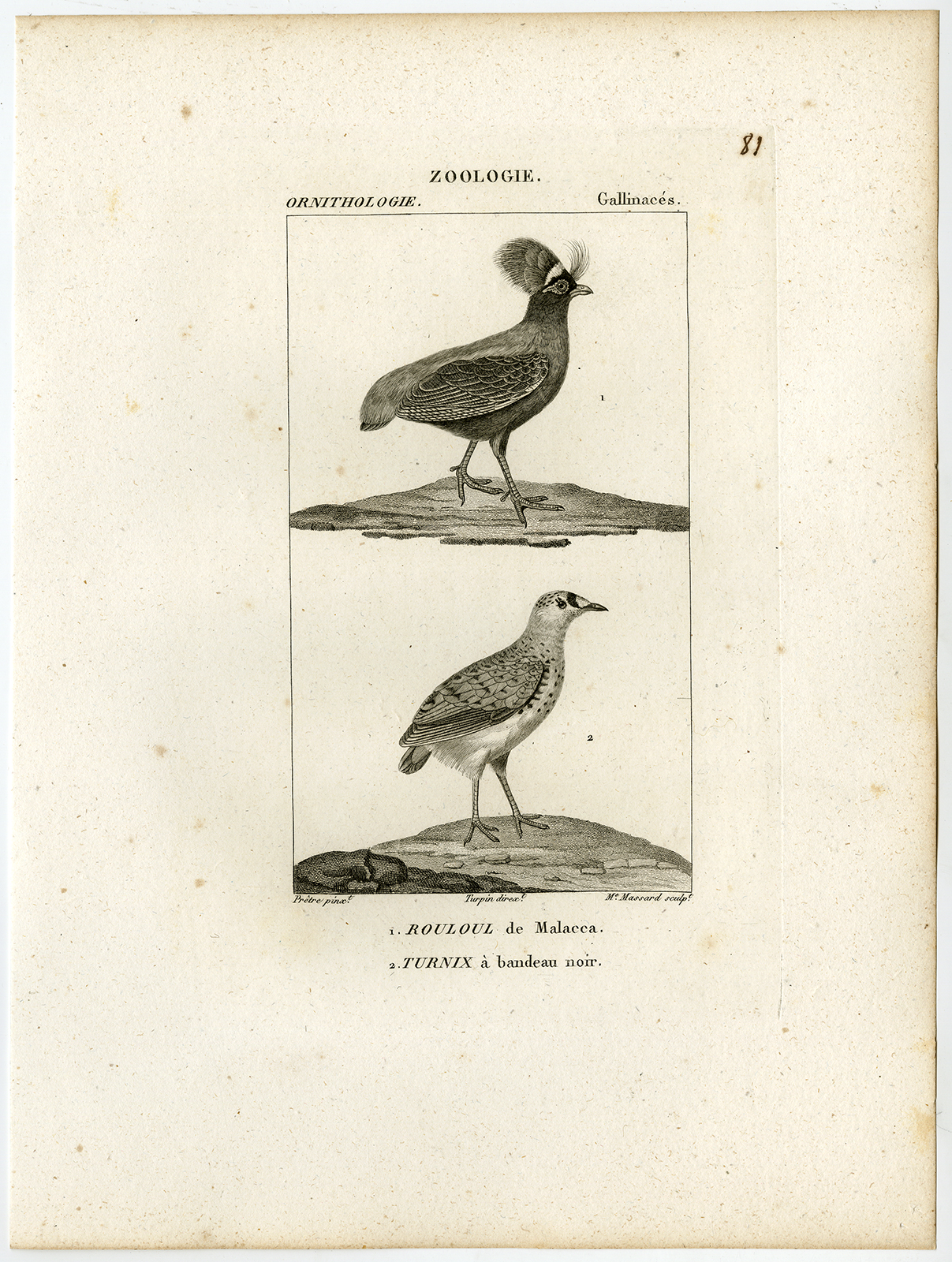 Onderwerp: Antieke prent, getiteld: ‘Pl. 81. Zoölogie, Ornithologie, Gallinaces. 1. Rouloul de Malakka – 2. Turnix een bandeau noir.’ – Dit bord toont vogelsoorten; kuifpatrijs en knoopkwartel.