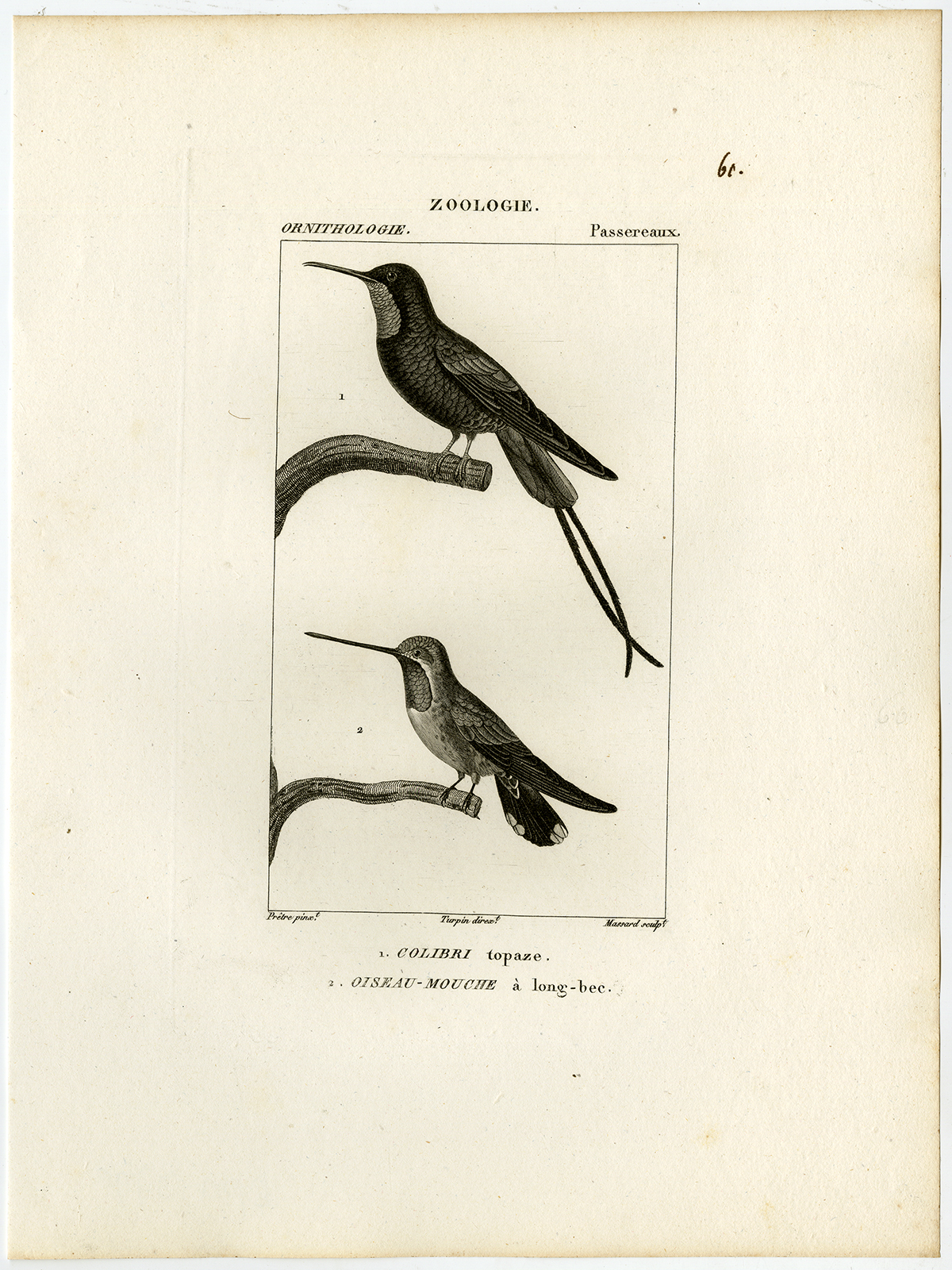 Onderwerp: Antieke prent, getiteld: ‘Pl. 60. Zoölogie, Ornithologie, Passereaux. 1. Colibri topaze – 2. Oiseau-mouche a long-bec.’ – Dit bord toont vogelsoorten; karmozijnrode topaaskolibrie en een andere kolibriesoort.