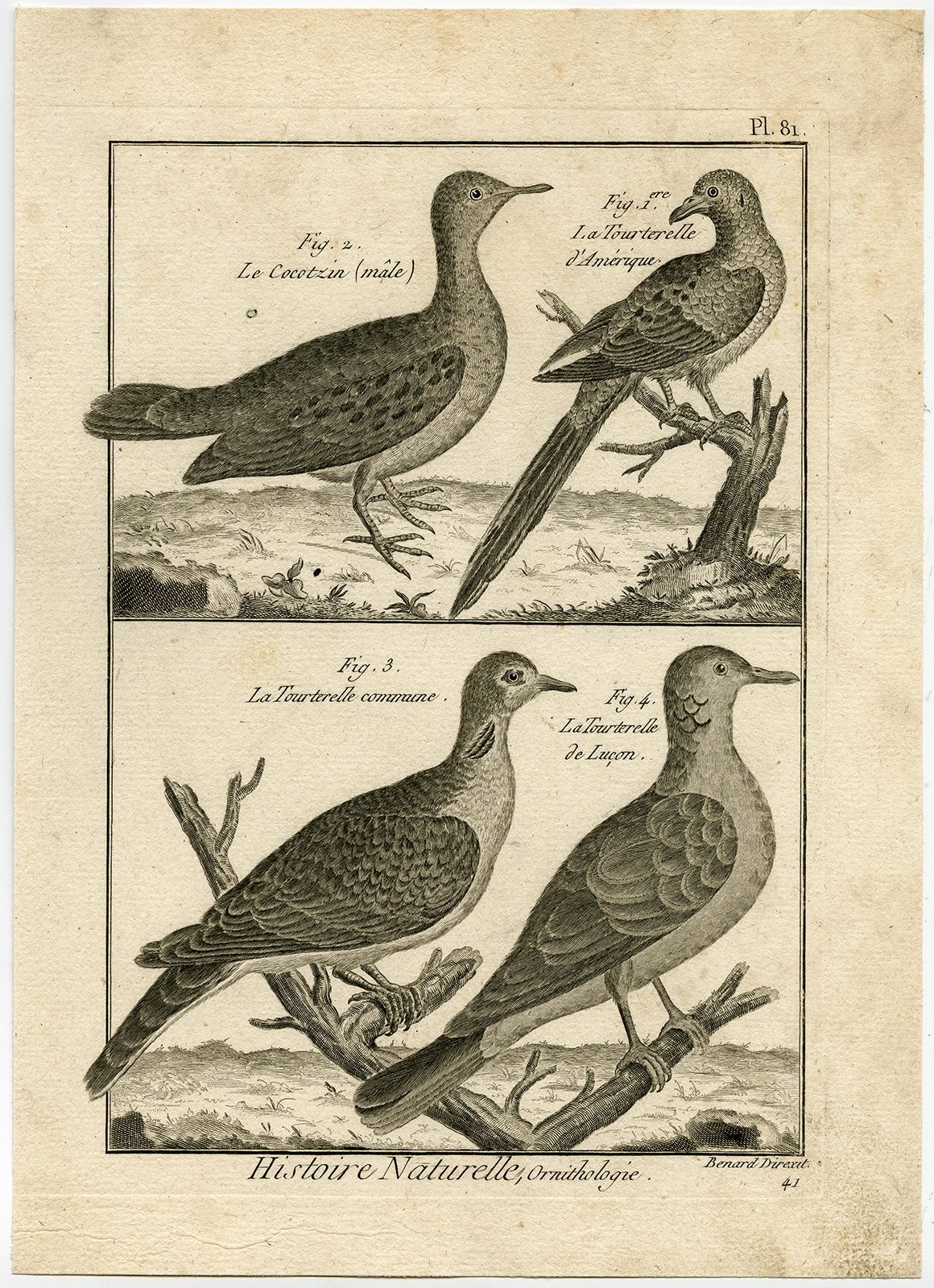 Onderwerp: Antieke prent, getiteld: ‘Pl. 81. Natuurlijke historie, ornithologie Afb. 1. De Amerikaanse Tortelduif – 2. De Cocotzin – 3. De Gewone Tortelduif – 4. De Lucon Tortelduif.’ – Op deze plaat staan diverse duiven/duiven afgebeeld; Amerikaanse tortelduif, gewone tortelduif enz.