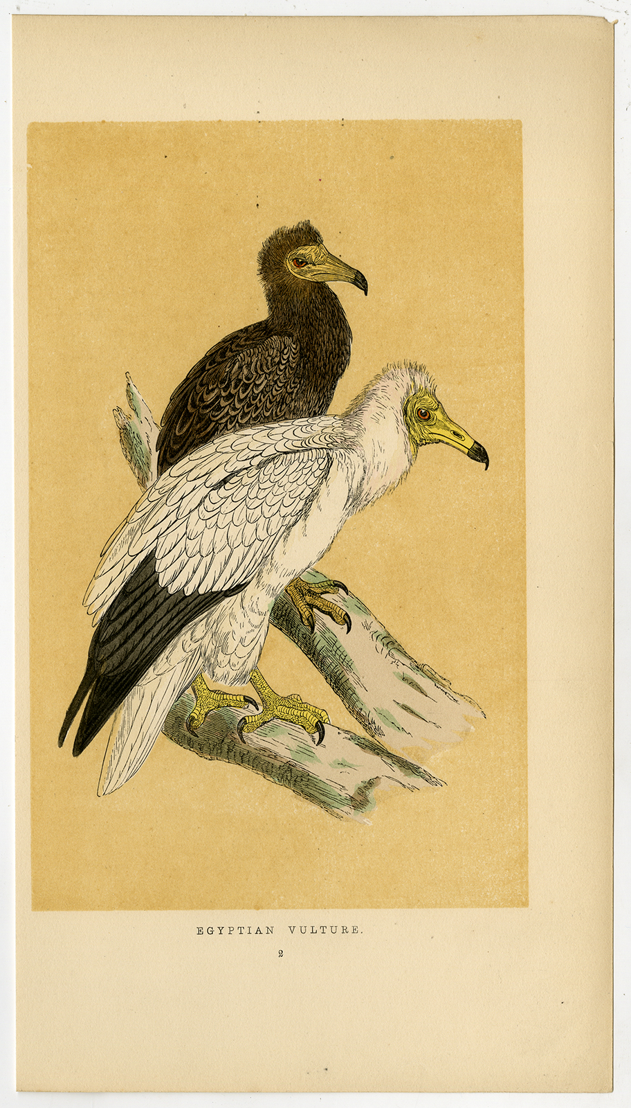 Onderwerp: Antieke prent, getiteld: ”Egyptische gier.” – Deze antieke prent toont de Egyptische gier (Neophron percnopterus), ook wel de witte aasetergier of farao’s kip genoemd.