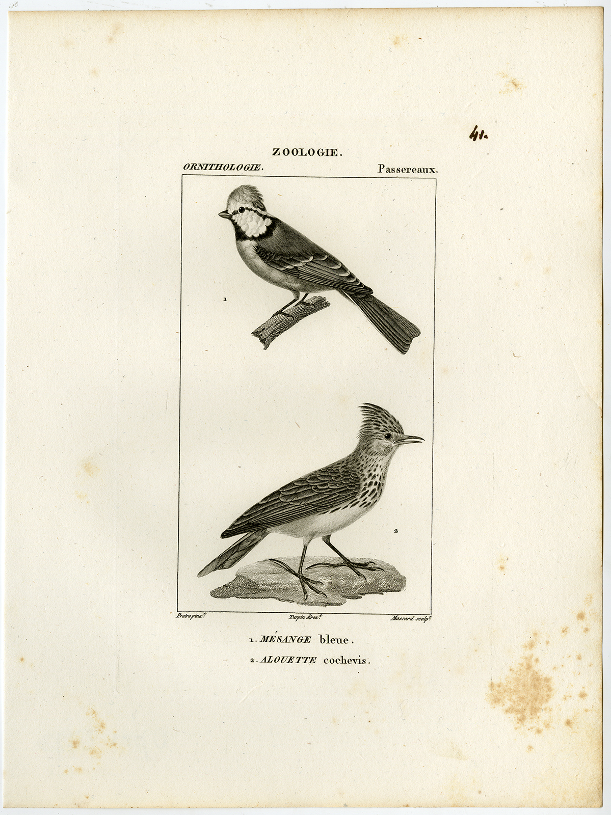 Onderwerp: Antieke prent, getiteld: ‘Pl. 41. Zoölogie, Ornithologie, Passereaux. 1. Mesange bleue – 2. Alouette cochevis.’ – Dit bord toont vogelsoorten; Europees-Aziatische pimpelmees en kuifleeuwerik.