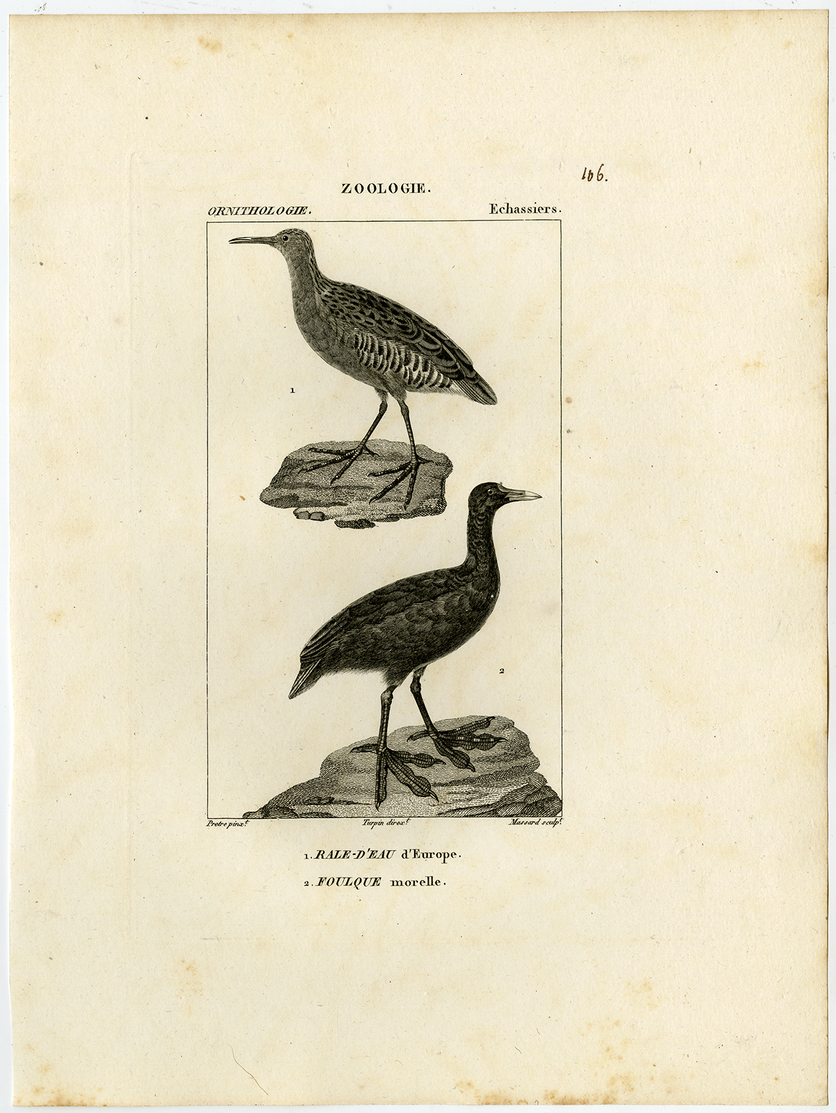 Onderwerp: Antieke prent, getiteld: ‘Pl. 106. Zoölogie, Ornithologie, Echassiers. 1. Rale-d’eau d’Europe – 2. Foulque morelle.’ – Dit bord toont vogelsoorten; waterral en Euraziatische meerkoet.