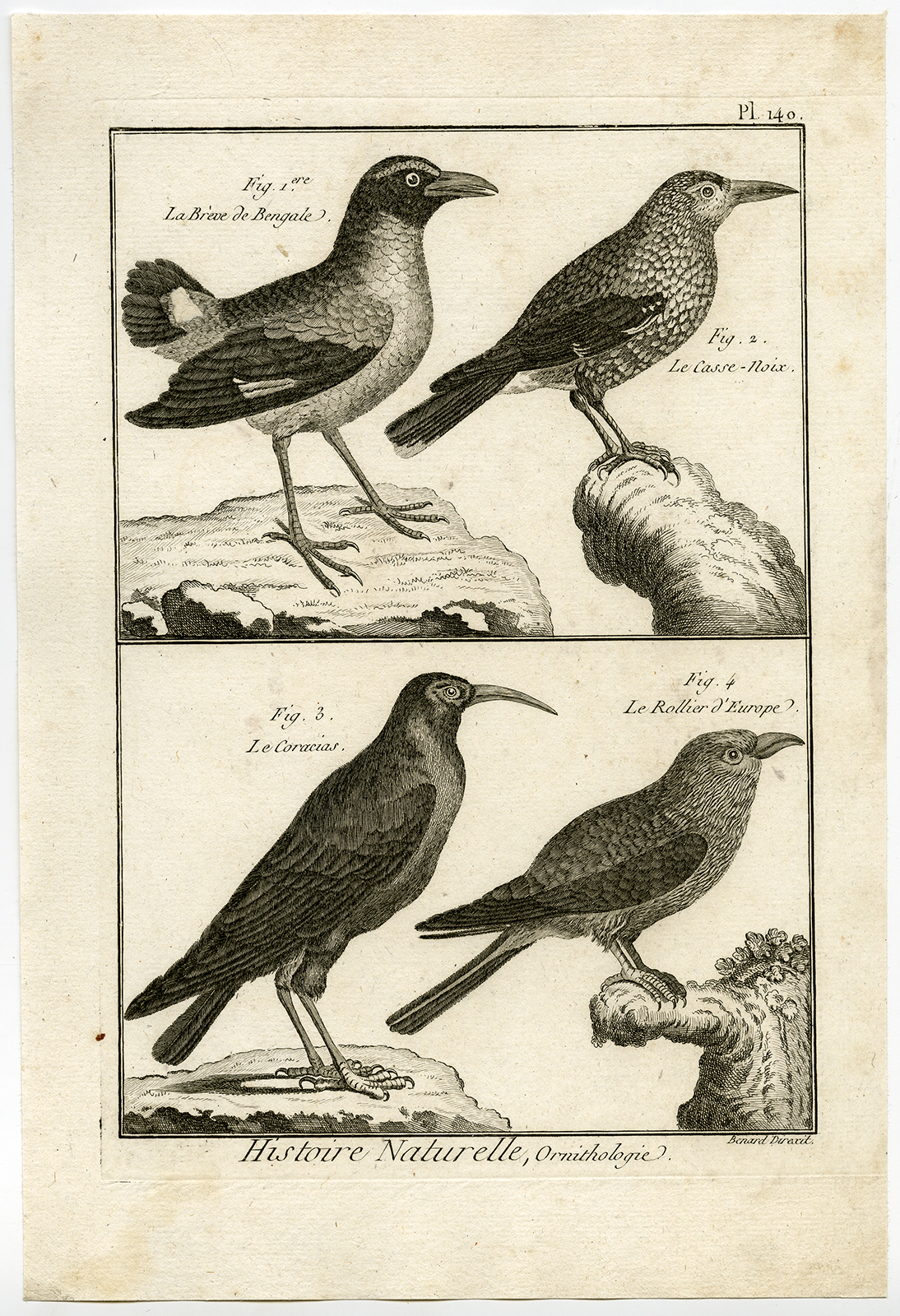 Onderwerp: Antieke prent, getiteld: ‘Pl. 140. Histoire Naturelle, Ornithologie Fig. 1. La Breve de Bengale – 2. Le Casse Noix – 3. Le Coracias – 4. Le Rollier d’Europe.’ – Dit bord toont verschillende vogelsoorten; Notenkraker, Europese rol enz.
