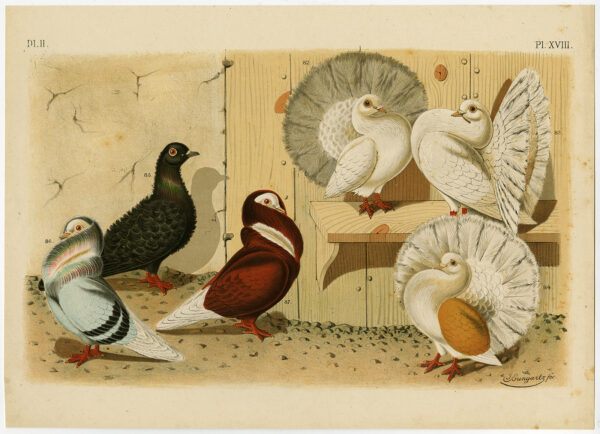 Onderwerp: Antieke prent, getiteld: ‘Pl. XVIII.’ – Op dit bord staan diverse sier (sier)duiven afgebeeld.