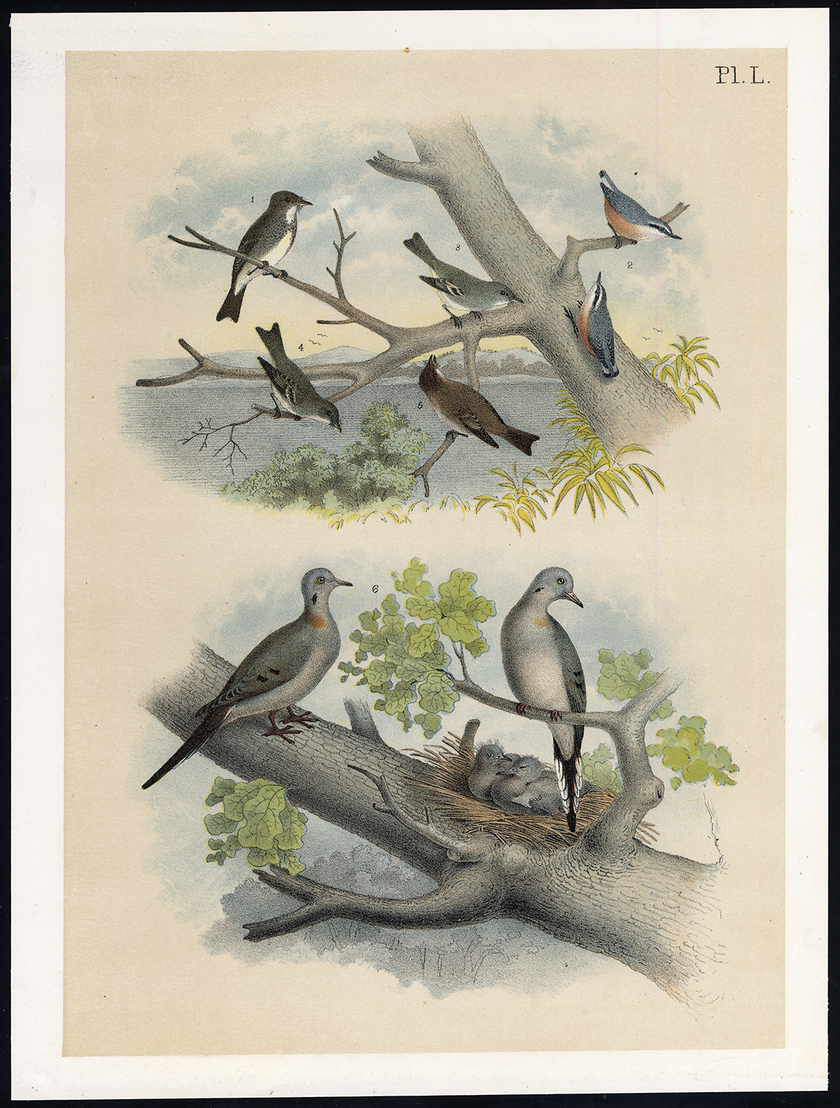 Onderwerp: Plaat L: Deze plaat toont vogelsoorten; 1. Olijfzijdige vliegenvanger – 2. Roodbuikboomklever – 3. Wood Pewee – 4. Traill’s vliegenvanger – 5. Pewit Flycatcher, of Phoebe-Bird – 6. Mourning Turtle, of Carolina Dove.
