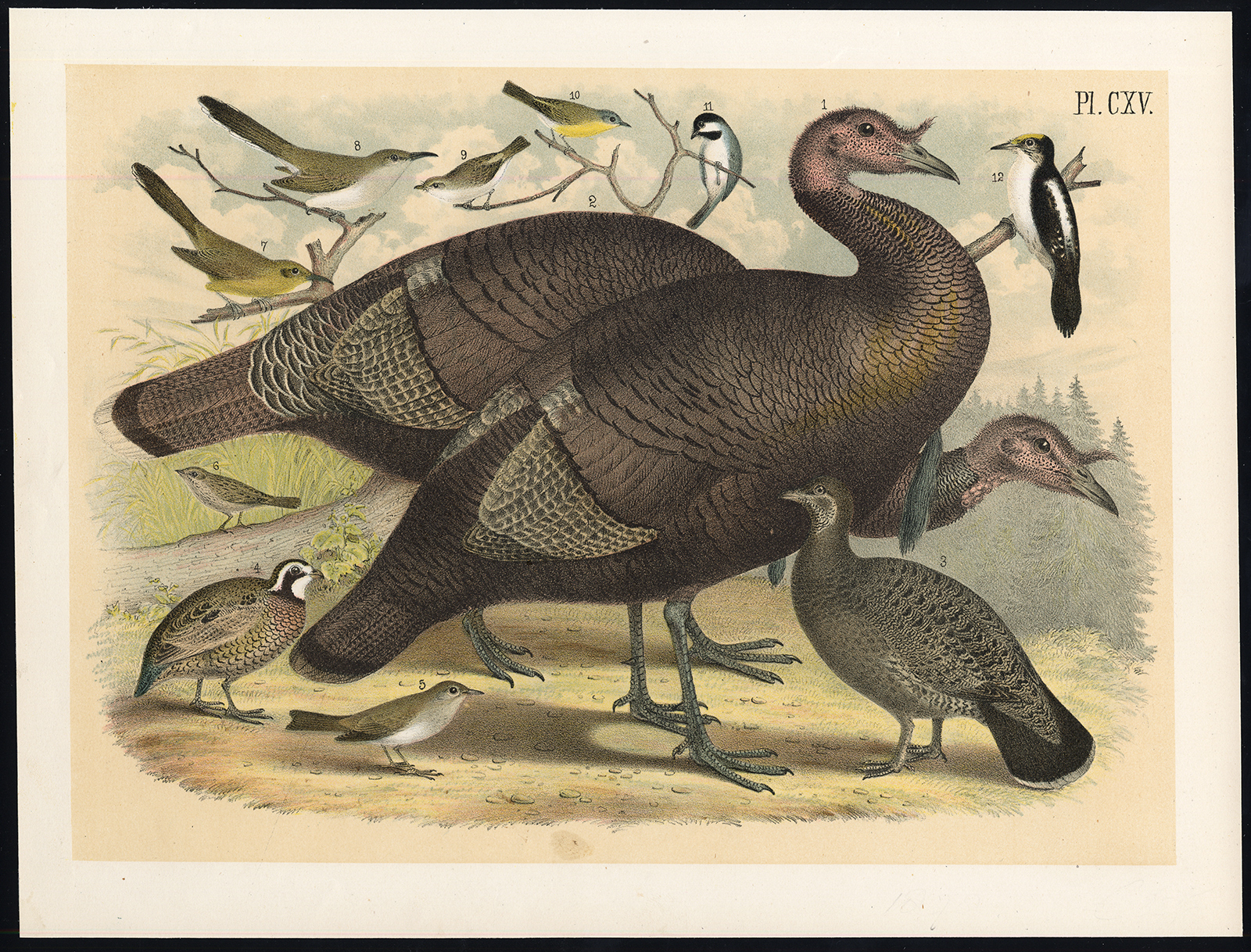 Onderwerp: Plaat CXV: Deze plaat toont vogelsoorten; 1-2. Gemeenschappelijke Wilde Kalkoen – 3. Dusky Grouse; Grijze korhoen; Blauwe korhoen; Dennenhoen – 4. Texas kwartel – 5. Alice’s lijster; Grijze geruite lijster – 6. Henslow’s Gors – 7. Mangrovekoekoek – 8. Zwartgevlekte koekoek – 9. Brotherly-Love Vireo; Philadelphia Greenlet – 10. Nashville-zanger – 11. Mees met lange staart – 12. Gestreepte of drievingerige specht.