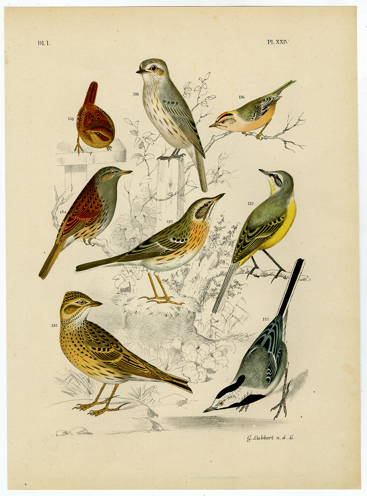 Onderwerp: Plaat XXIV: 131. Leeuwerik (Lark.); 135. Winterkoninkje (Winterwinterkoninkje); 136. Goudhaantje (Goldcrest.); 137. Gele Kwikstaart (Gele Kwikstaart.); 138. Witte Kwikstaart (Witte Kwikstaart.)