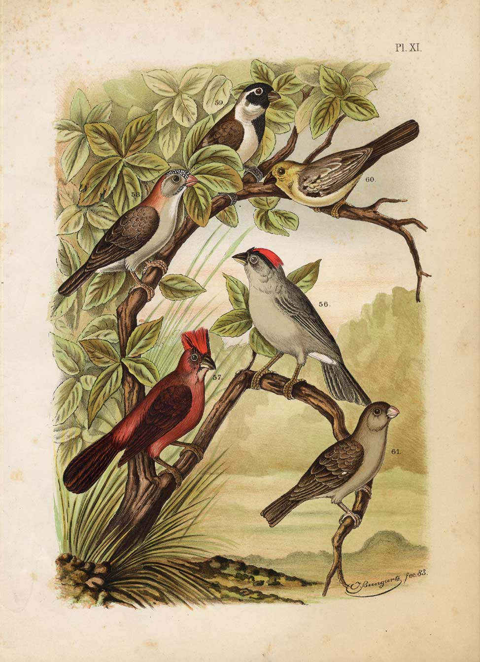 Onderwerp: Plaat XI: 56. De kroon van Zuid-Amerika – Fringilla pileata (roodharige vink.); 57. De Kroonvink van Ecuador – Roodkopvink.; 58. De geschubde voorhoofd-musch – Fringilla frontalis (Frontaal korhoen.); 59. De Kaapsche Musch – Gebogen franje (Kaapse mus.); 60. De Goudmusch – Fringilla lutea (Gouden mus.)