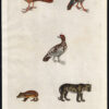 Onderwerp: Plaat XCVIII: Deze plaat toont verschillende vogelsoorten; 1. Koning van de gieren – 2. Gekuifde zwarte gier – 3. Grijze kwikstaart – 4. Muurkruiper – 5. Paarse waterduivin (Paarse Swamphen) – 6. Spoorvleugelige waterduivin.