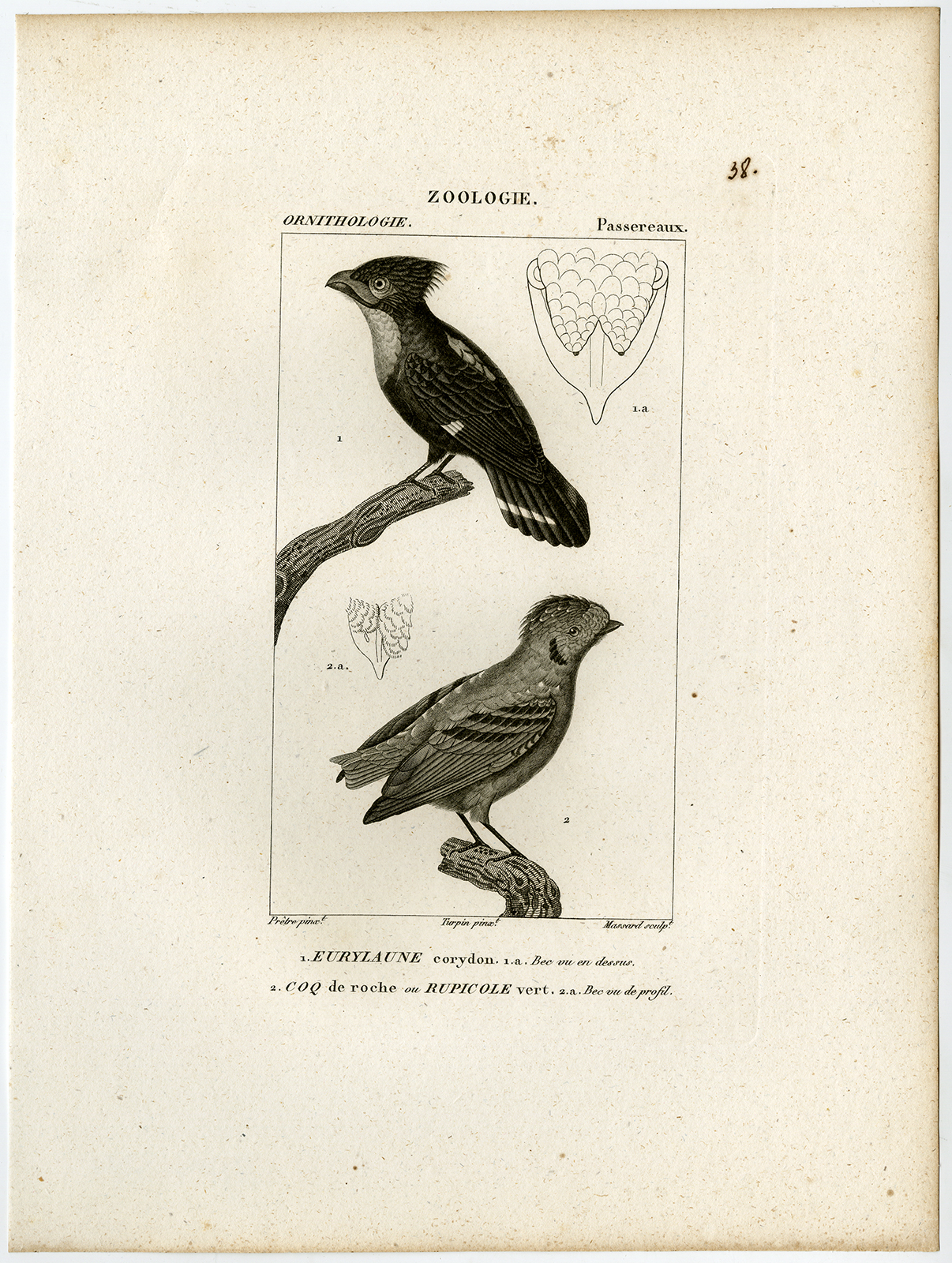 Onderwerp: Antieke prent, getiteld: ‘Pl. 38. Zoölogie, Ornithologie, Passereaux. 1. Eurylaune corydon – 2. Coq de roche of Rupicole vert.’ – Dit bord toont vogelsoorten; groene breedbek en een andere soort.