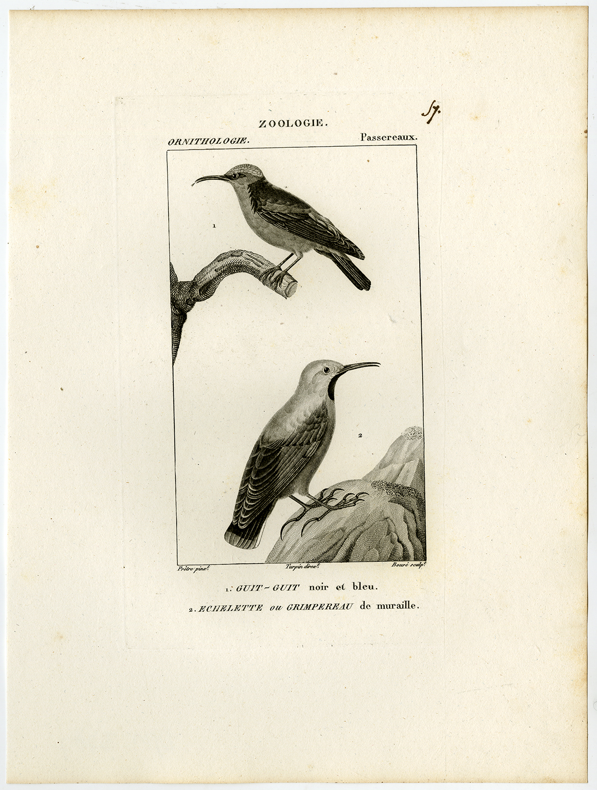 Onderwerp: Antieke prent, getiteld: ‘Pl. 57. Zoölogie, Ornithologie, Passereaux. 1. Guit-guit noir et bleu – 2. Echelette ou Grimpereau de muraille.’ – Dit bord toont vogelsoorten; groene honingkruiper en de muurkruiper.