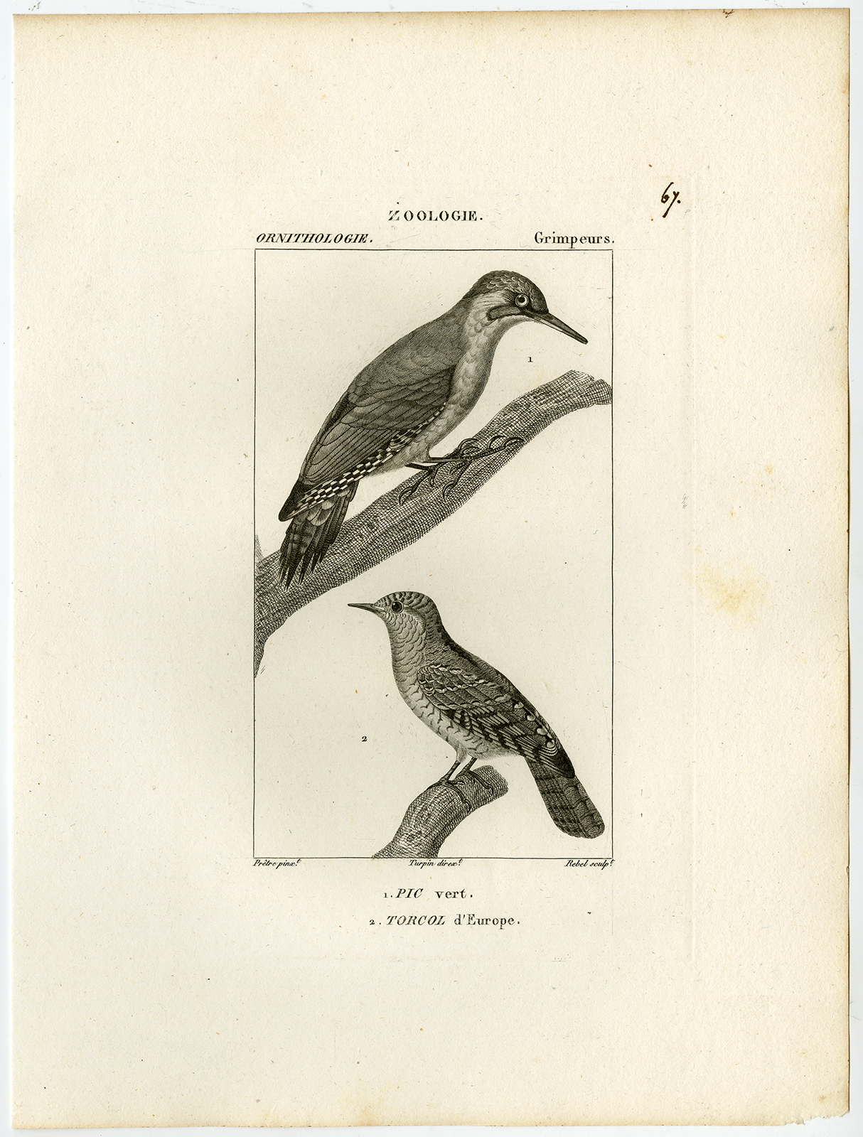 Onderwerp: Antieke prent, getiteld: ‘Pl. 67. Zoölogie, ornithologie, Grimpeurs. 1. Pic vert – 2. Torcol d’Europe.’ – Dit bord toont vogelsoorten; Europese groene specht en Euraziatische draaihals.