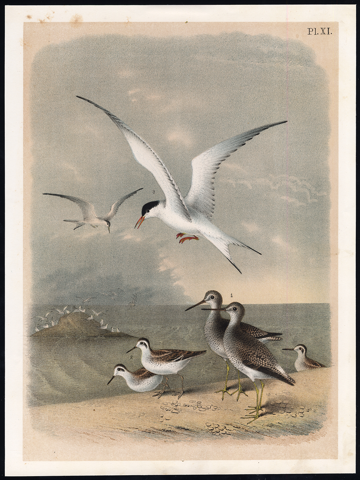 Onderwerp: Plaat XI: Deze plaat toont vogelsoorten; 1. Geelvoorhoofdsnip – 2. Halfgepalmde strandloper – 3. Grote stern of zeezwaluw.