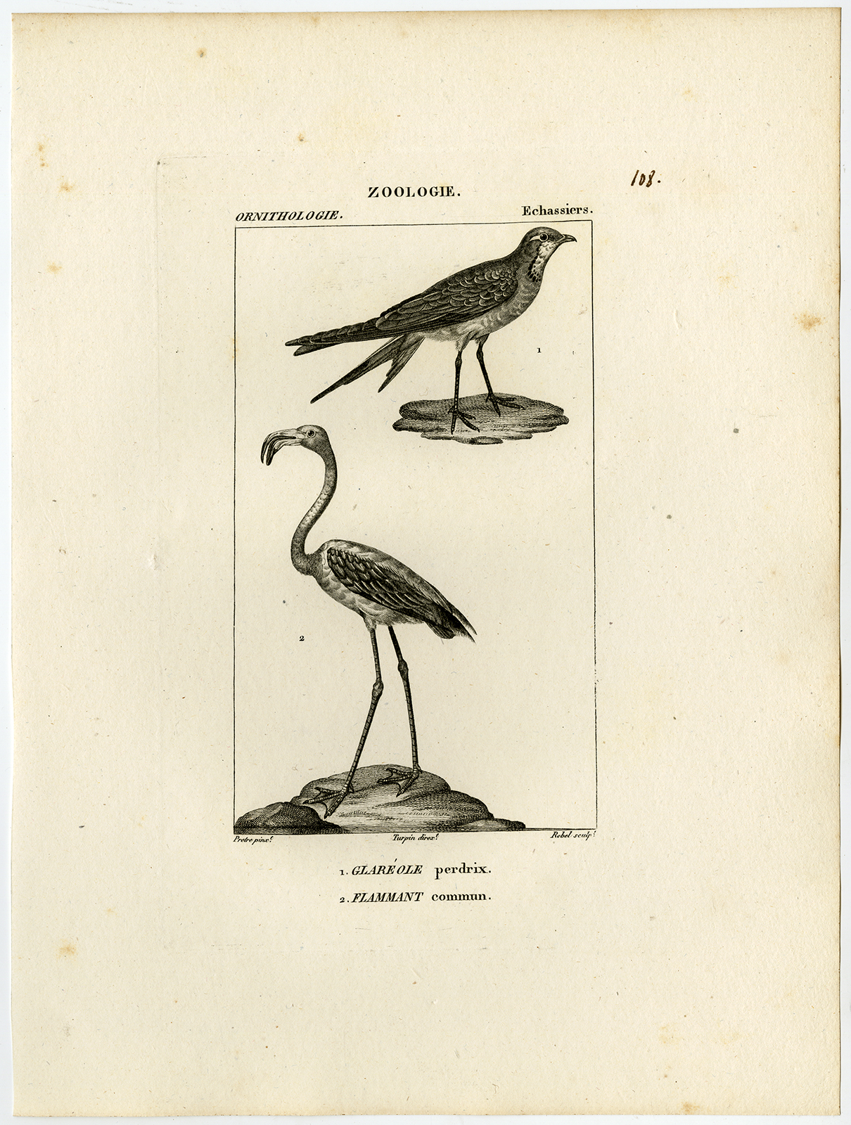 Onderwerp: Antieke prent, getiteld: ‘Pl. 108. Zoölogie, Ornithologie, Echassiers. 1. Glareole perdrix – 2. Flammant commun.’ – Dit bord toont vogelsoorten; gemeenschappelijke pratincole en grotere flamingo.