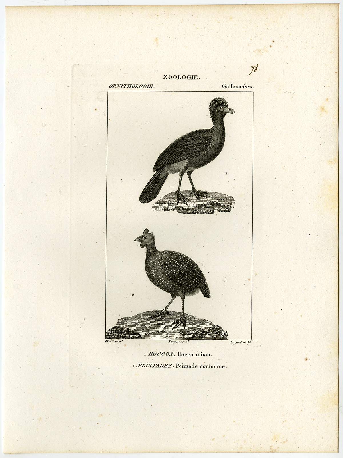 Onderwerp: Antieke prent, getiteld: ‘Pl. 78. Zoölogie, Ornithologie, Gallinaces. 1. Hocco mitou – 2. Peintade-gemeente.’ – Dit bord toont vogelsoorten; Alagoas curassow en parelhoen.